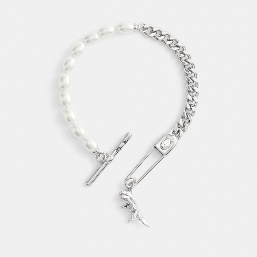 A modern mix of refined sophistication and utilitarian-chic style, this bracelet features a glass pearl strand combined with a chunky curb chain. Detailed with our skeletal Rexy charm, it’s finished with our Signature safety pin toggle closure.