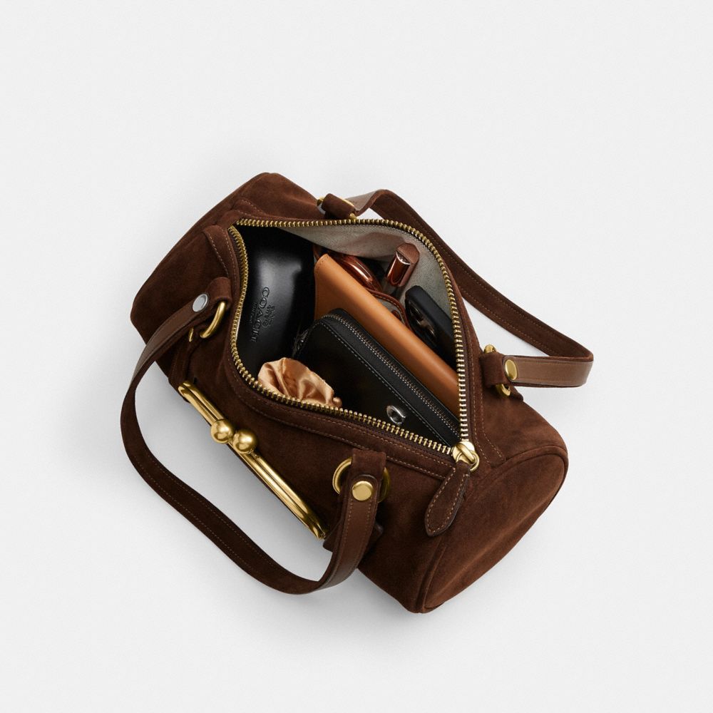 The Kisslock Barrel Bag is part of The Coach Originals, a collection of archival-inspired styles that celebrates our legacy and authentic New York heritage. The elongated cylindrical carryall is based on a 1973 Coach design reimagined for today. Crafted of velvety suede and soft full grain leather, it features an outside pocket secured by our kisslock closure—an innovative heritage detail inspired by vintage coin purses. The zip-top silhouette sits just beneath the underarm for hands-free convenience or can be carried by the top handles. Some styles are just too good to leave in the archives.