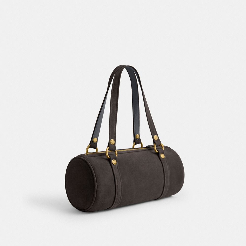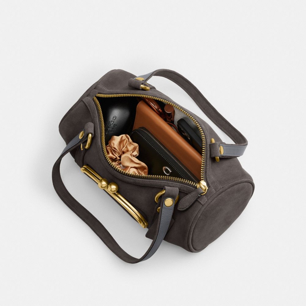 The Kisslock Barrel Bag is part of The Coach Originals, a collection of archival-inspired styles that celebrates our legacy and authentic New York heritage. The elongated cylindrical carryall is based on a 1973 Coach design reimagined for today. Crafted of velvety suede and soft full grain leather, it features an outside pocket secured by our kisslock closure—an innovative heritage detail inspired by vintage coin purses. The zip-top silhouette sits just beneath the underarm for hands-free convenience or can be carried by the top handles. Some styles are just too good to leave in the archives.