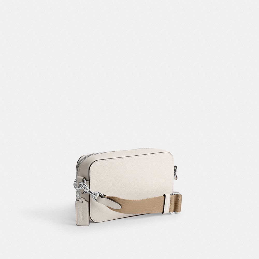 COACH®,Charter Slim Crossbody Bag With Coach Graphic,Leather,Crossbody,Embossed,Logo,Compact,Key Ring,Lined,Silver Metal,C...,Cream,Angle View