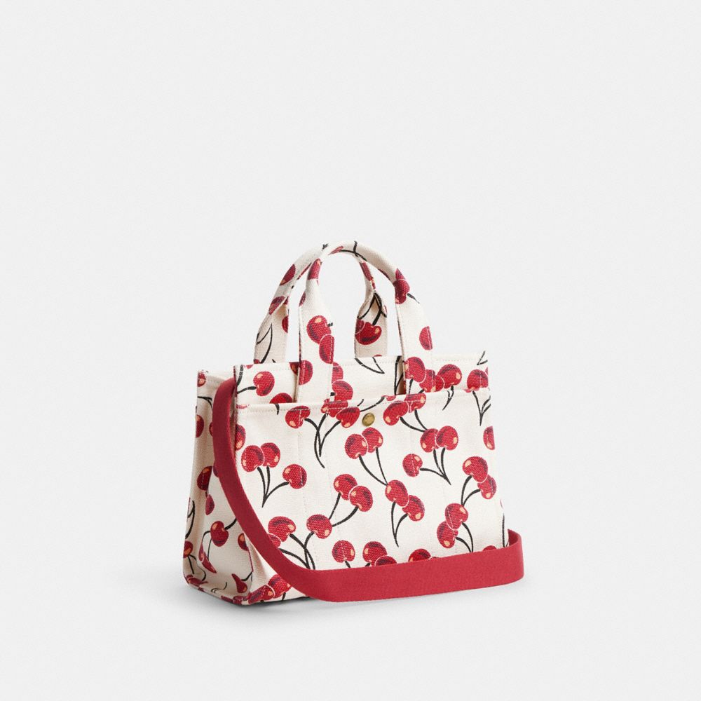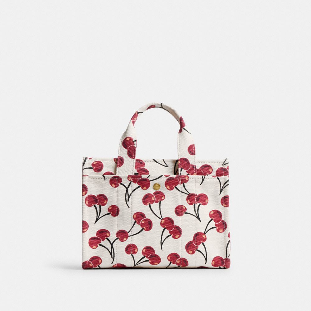 Carry as much (or as little) as you like with our lightweight Cargo tote. Detailed with our cursive Coach script embroidery and iconic turnlock closure, this compact 26 has an open interior with room for an iPad, two outside pockets for easy organization and a removable webbing strap for shoulder or crossbody wear. Printed with a cheerful cherry motif, this versatile canvas style is crafted with 100% cotton* sourced from farms that use regenerative agricultural practices—those that help to maintain and rejuvenate land, increase biological diversity and soil health, and could lead to increased carbon absorption. It’s inspired by our commitment to reducing our impact on the planet. Now no matter where you go with it, you’ll always be toting around a little extra love for the planet.