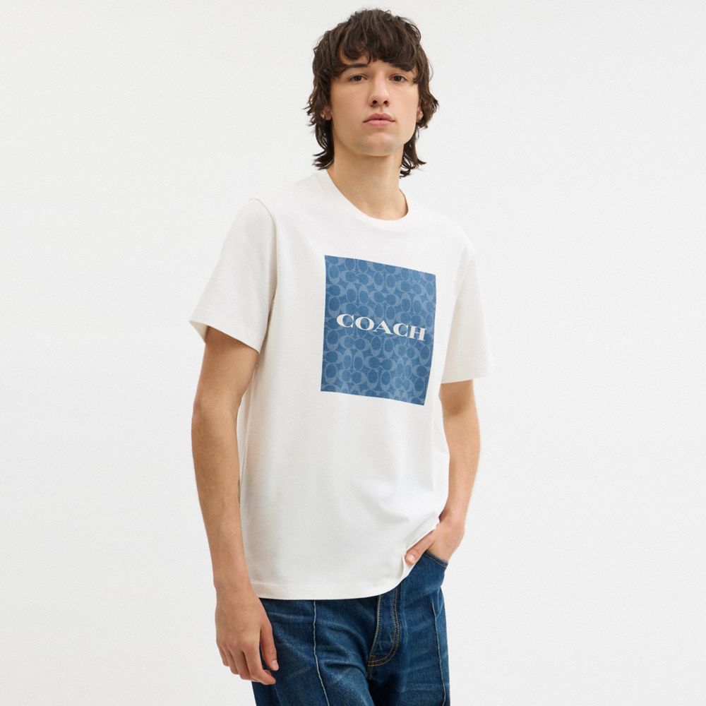 COACH®,Denim Signature Square T-Shirt In Organic Cotton,Organic Cotton,T Shirt,Casual,White,Front View