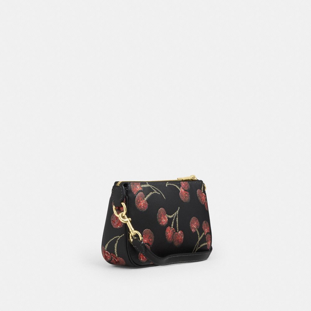 COACH®,Nolita 19 With Cherry Print,Leather,Wristlet,Shoulder Bag,Logo,Metal,Glitter,Sequin,Gold Metal,Day Party,Black,Angle View
