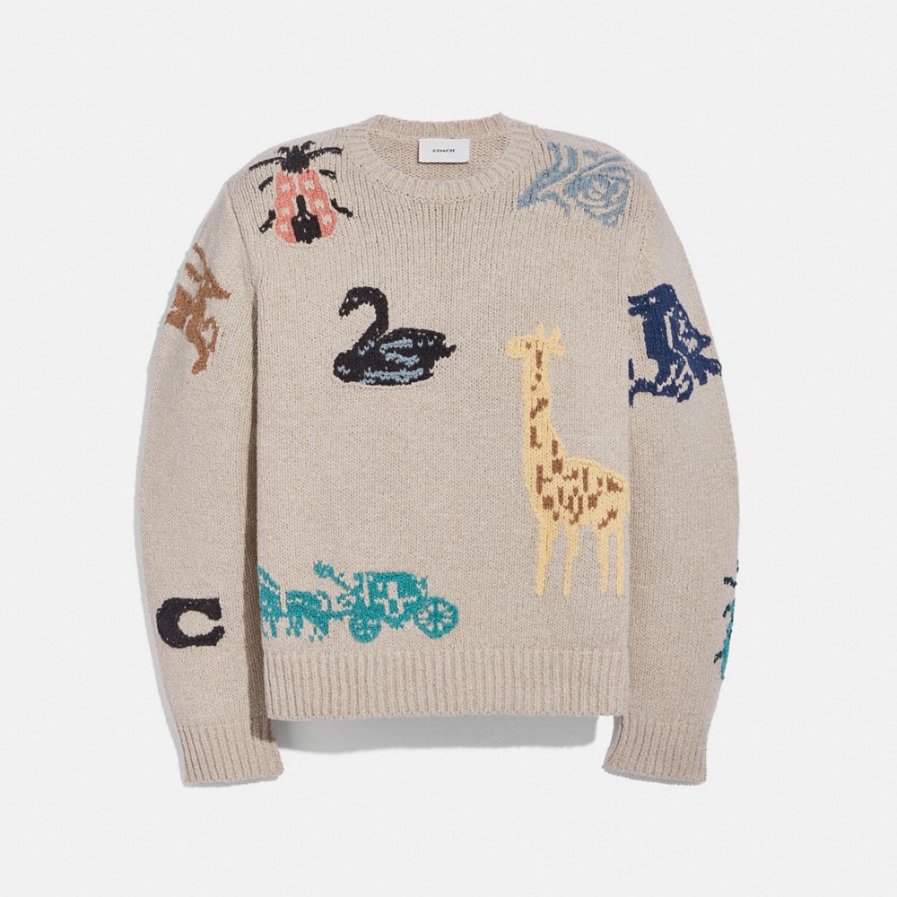 Show off some animal magnetism—this lightweight cotton sweater is intarsia knit with a menagerie of animals, insects, and Coach icons. The classic-fit crewneck is finished with ribbed edges.