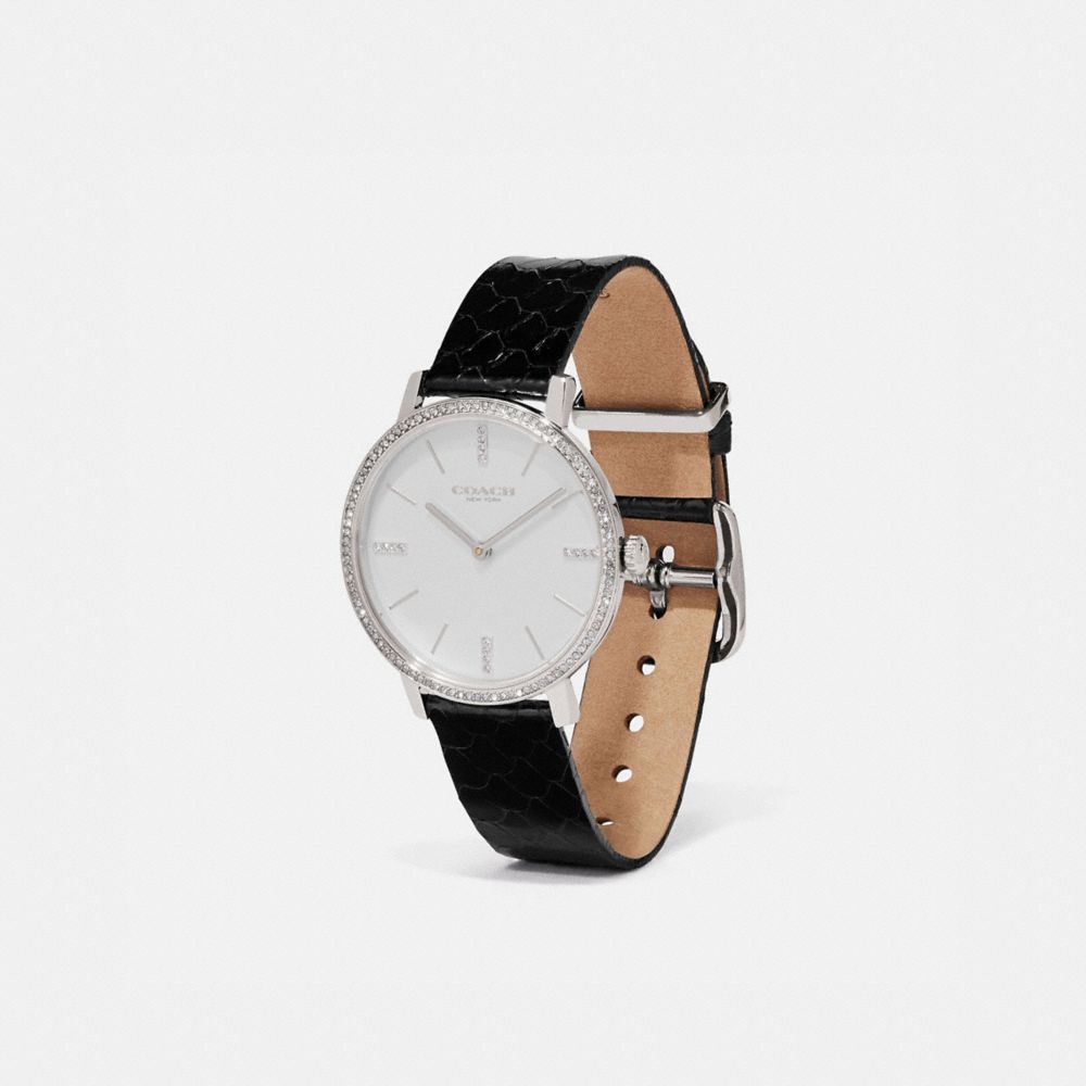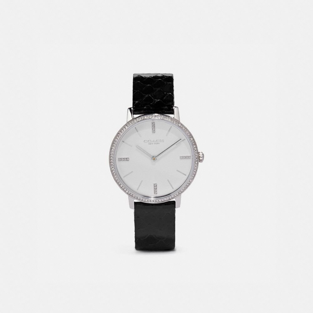 A sophisticated minimalist design, the Audrey is a refined watch perfect for day and evening. Finished with a smooth leather strap, this streamlined design sparkles with a sparkling crystal bezel, markers and keeper.