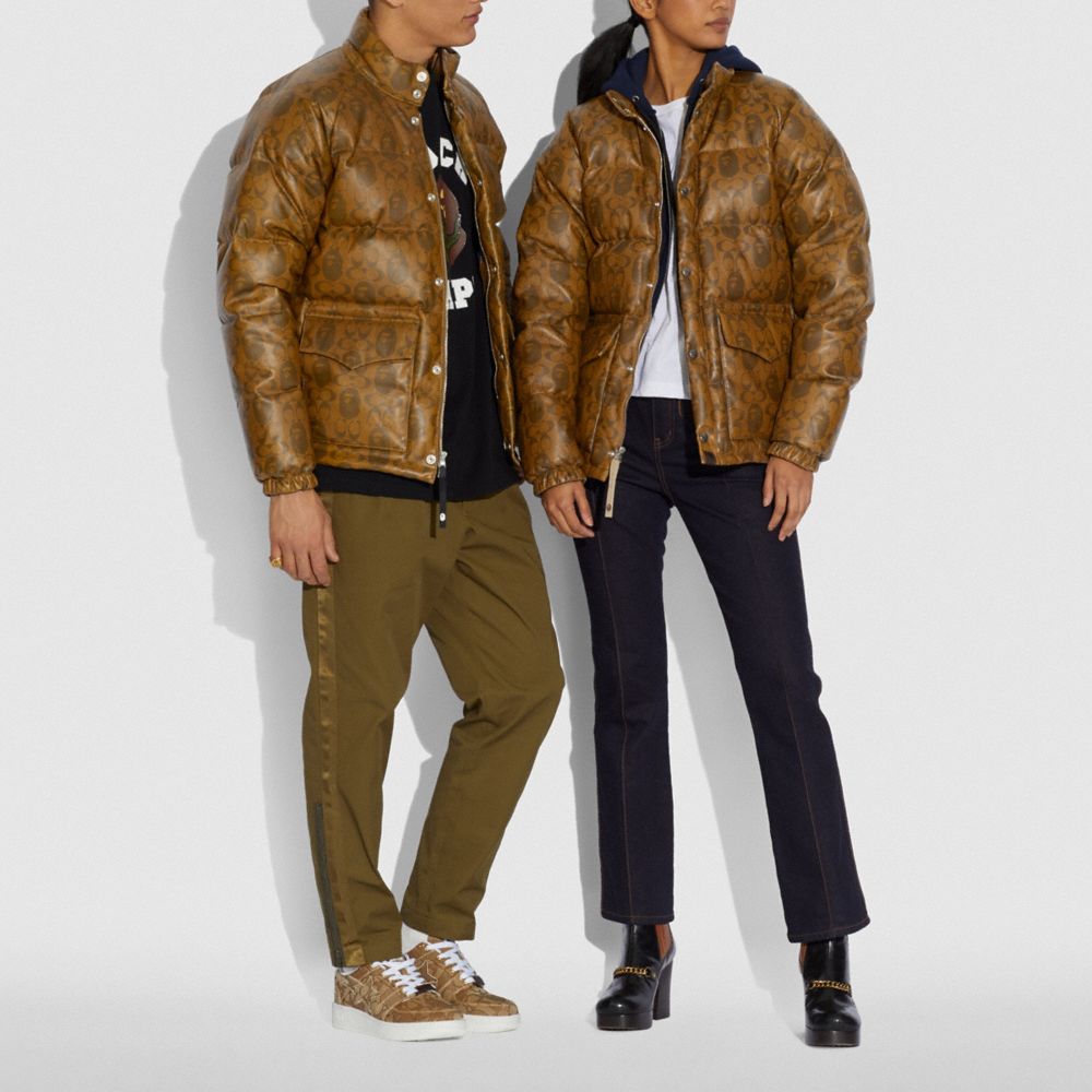 Coach collaborates with the cult-favorite streetwear label BAPE on a playful, animated collection that combines our New York attitude with the Tokyo-based brand’s bold, rebellious style. Crafted of smooth leather, this warm down-filled puffer jacket is printed with a disruptive take on our Signature featuring BAPE’s trademark Ape Head. It’s finished with oversized slip-and-patch pockets.