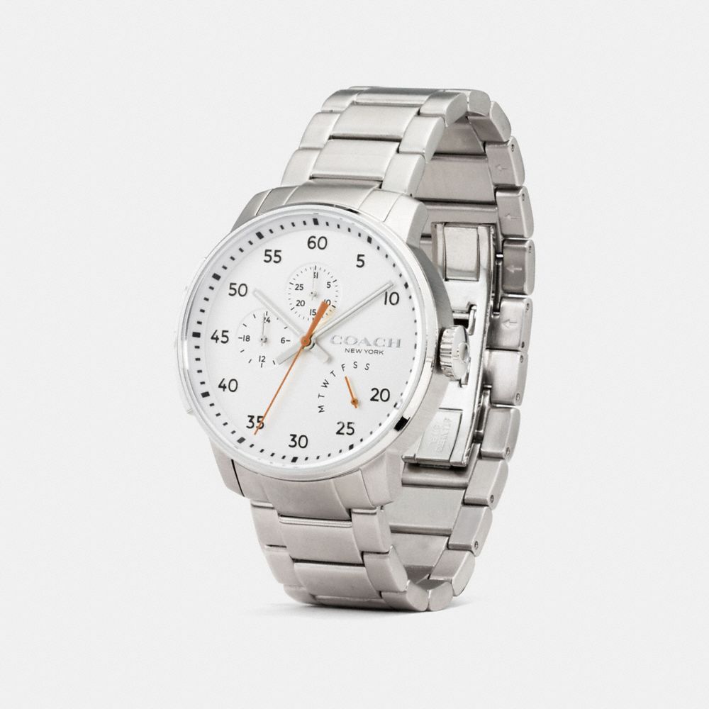 Sporty design meets high-tech functionality on the Bleecker watch. The stainless steel design features three subdials that display hours, minutes and the day of the week.