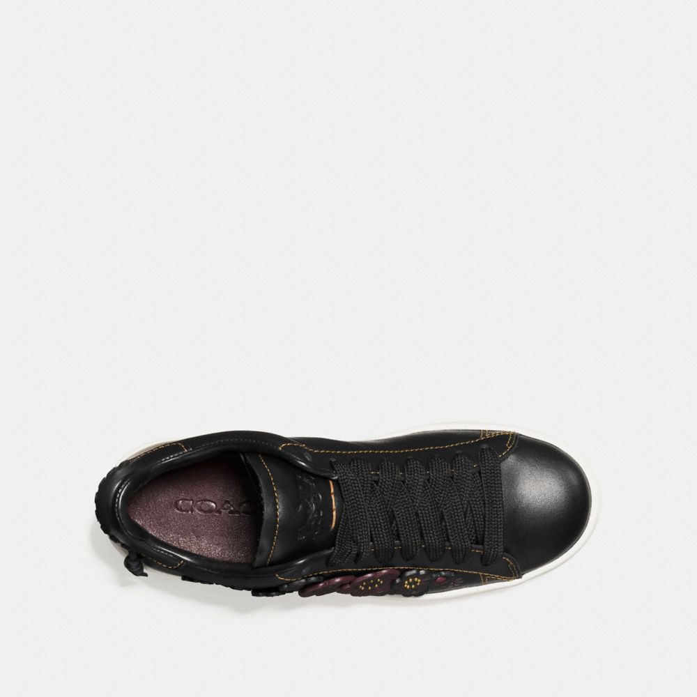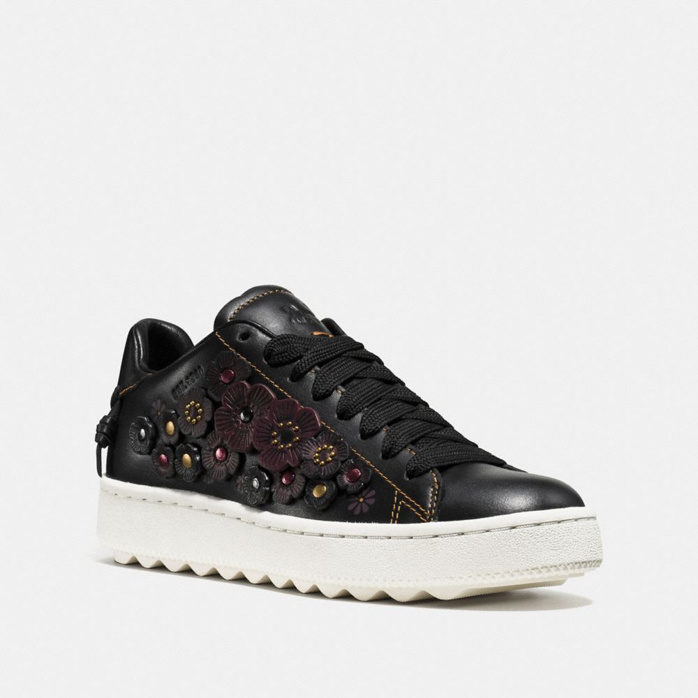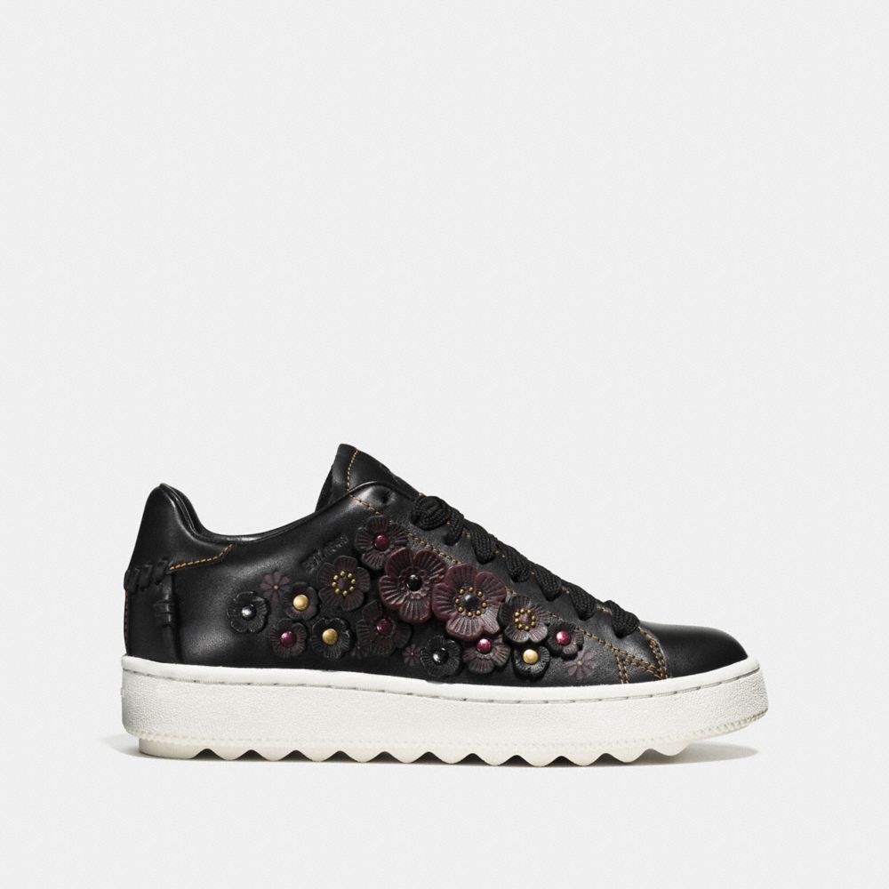 Inspired by classic tennis trainers, our popular sneaker silhouette is updated with Tea Rose appliqué, pearly cabochons and glittery studs. It easily conquers the concrete with a recessed ripple outsole for traction. Rip and Repair detailing with baseball-inspired stitching adds a traditional note of Coach craftsmanship.