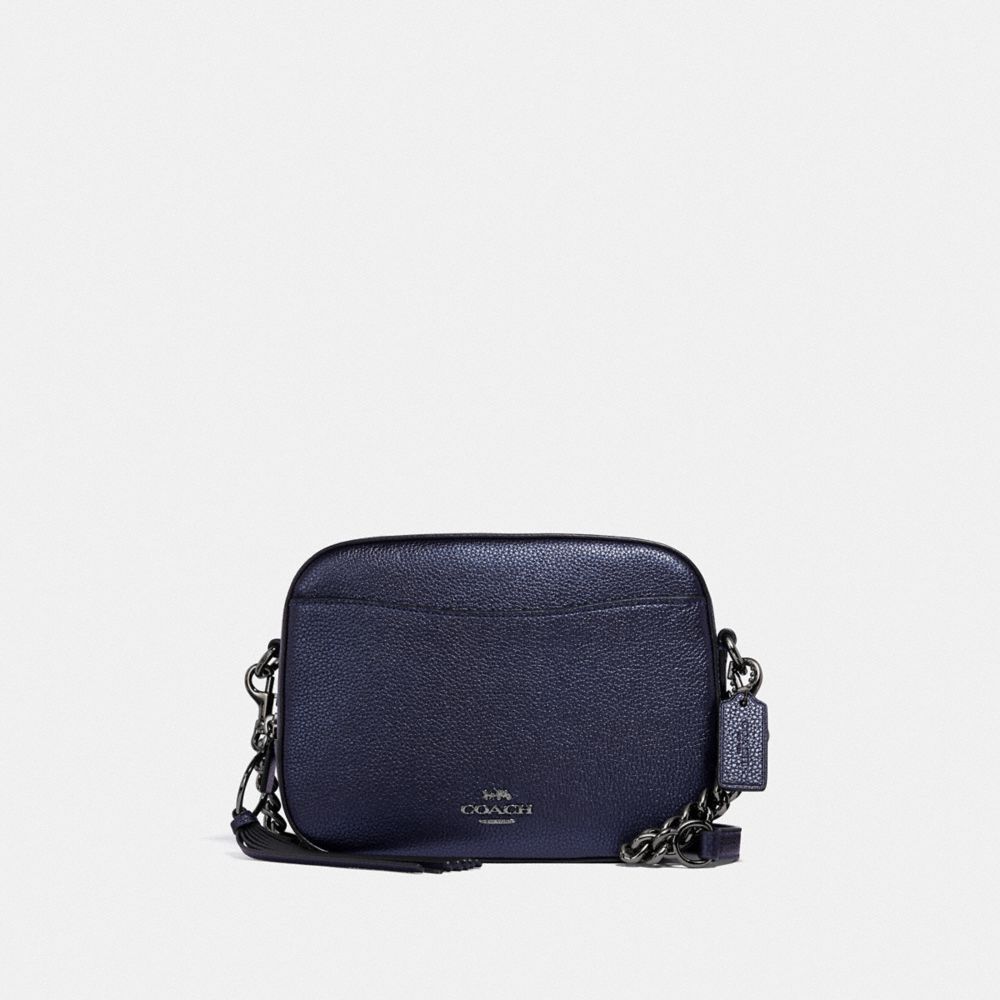 Inspired by vintage camera bags, this simple silhouette unzips to reveal a spacious compartment. The minimalist, everyday design is crafted in polished pebble leather with a brilliant metallic sheen.