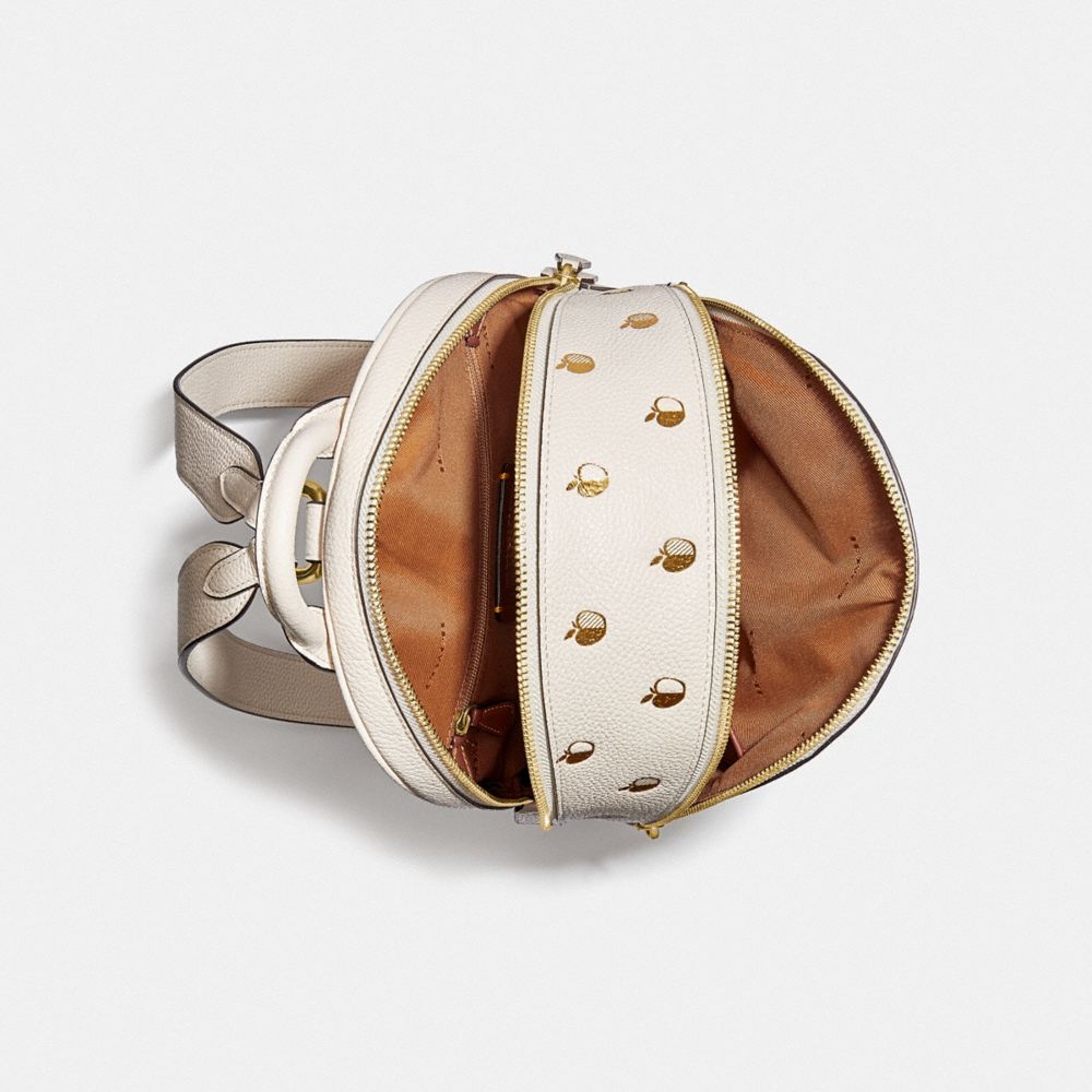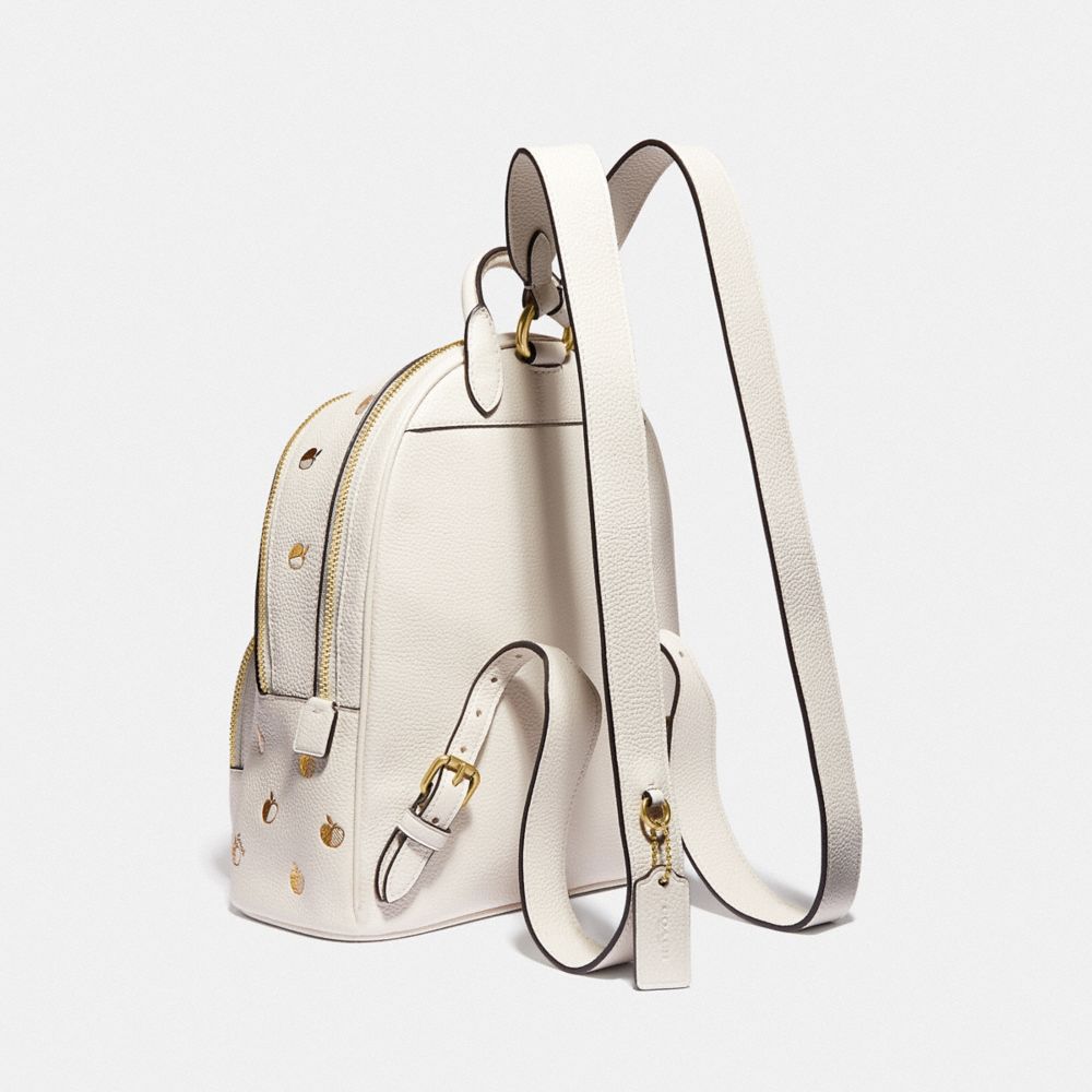 A bag that has your back, our sophisticated Carrie is a lightweight, hands-free style with a modern, compact design. This petite backpack has an organized two-compartment interior and an exterior zip pocket for easy access to a phone, wallet and other essentials. It’s crafted of polished pebble leather featuring a shimmery metallic foil apple print and finished with comfortable, adjustable shoulder straps.