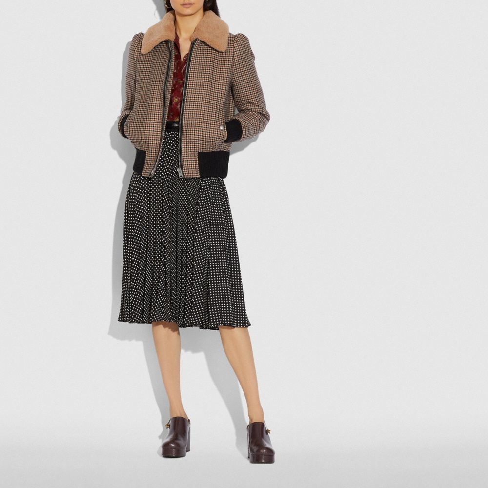Based on vintage military jackets, this slim-fitting aviator style is crafted of refined houndstooth tweed with a removable plush shearling collar. It’s finished with snap pockets and gathered shoulders for a touch of volume.