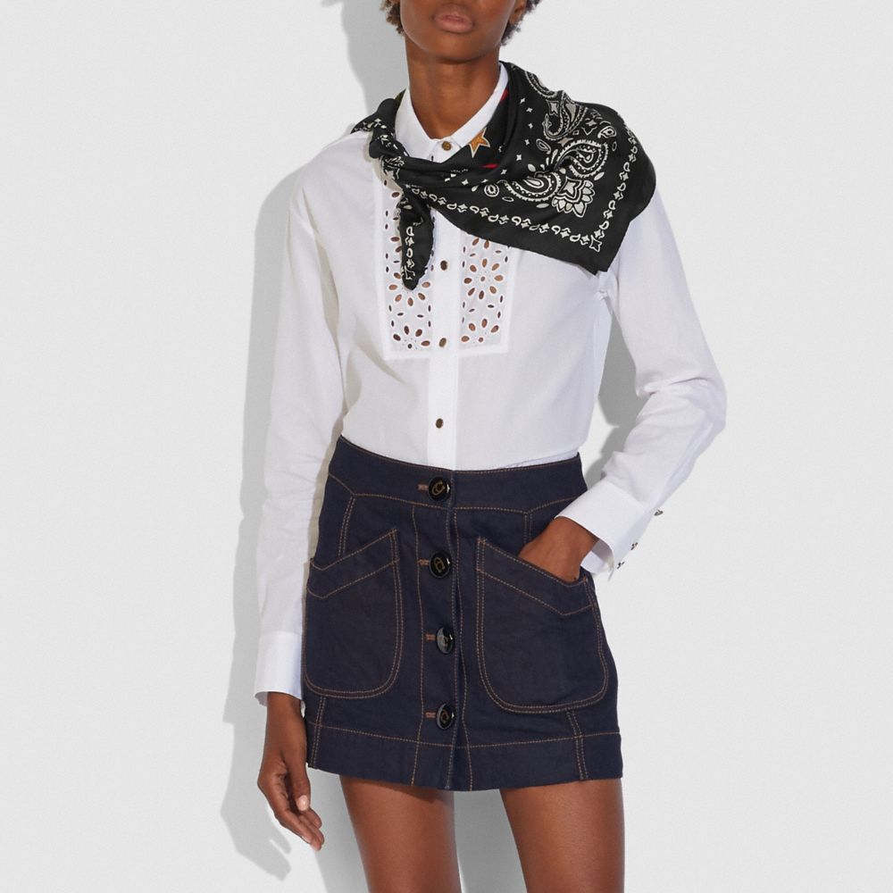 This silk scarf features Coach mascots, Rexy, Uni and Sharky along with stars, strawberries and our nostalgic retro-cool cherry motif. The lightweight bandana is finished with a traditional Americana paisley pattern.