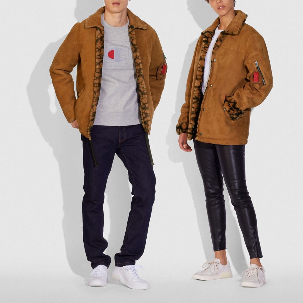 A limited-edition collection celebrating the legacies of two American icons, this collaboration combines Coach craftsmanship with the heritage of Champion athleticwear. Try a little luxe. Our plush shearling jacket reveals a hybrid of our Signature and the Champion "C" at the interior. The snap-front style is finished with snap pockets and a zip pocket on one sleeve detailed with the athleticwear label’s logo.