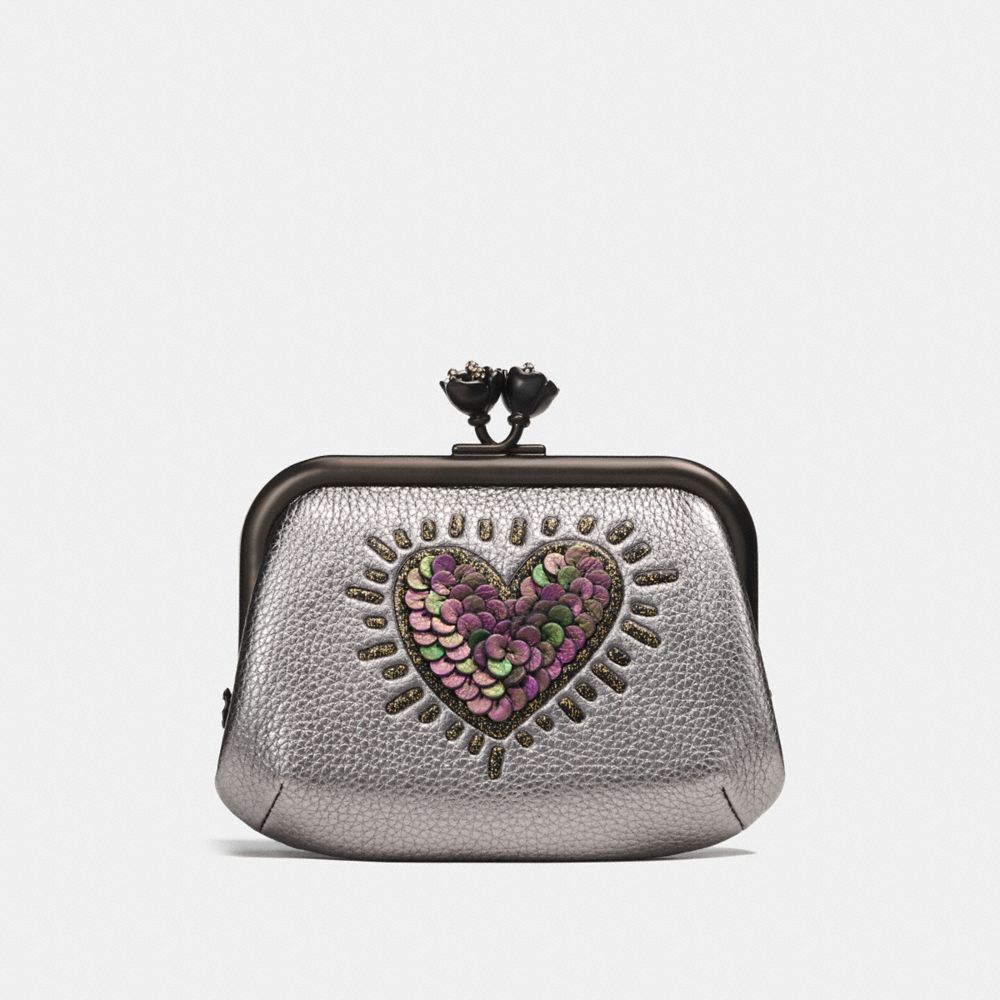 This petite pouch features work from artist Keith Haring, combining his iconic illustrations with Coach’s signature craft and all-American attitude. Made from glovetanned leather detailed with leather “sequins”, this compact design features four credit card slots. Undo the Tea Rose clasp to reveal an interior lined with Haring graphics and prairie florals.