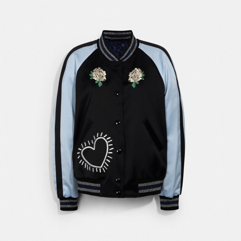 This jacket features works from artist Keith Haring, combining his iconic illustrations with Coach’s signature craft and all-American attitude. The satin varsity reverses to a design featuring the artist’s motifs mixed with our prairie florals.
