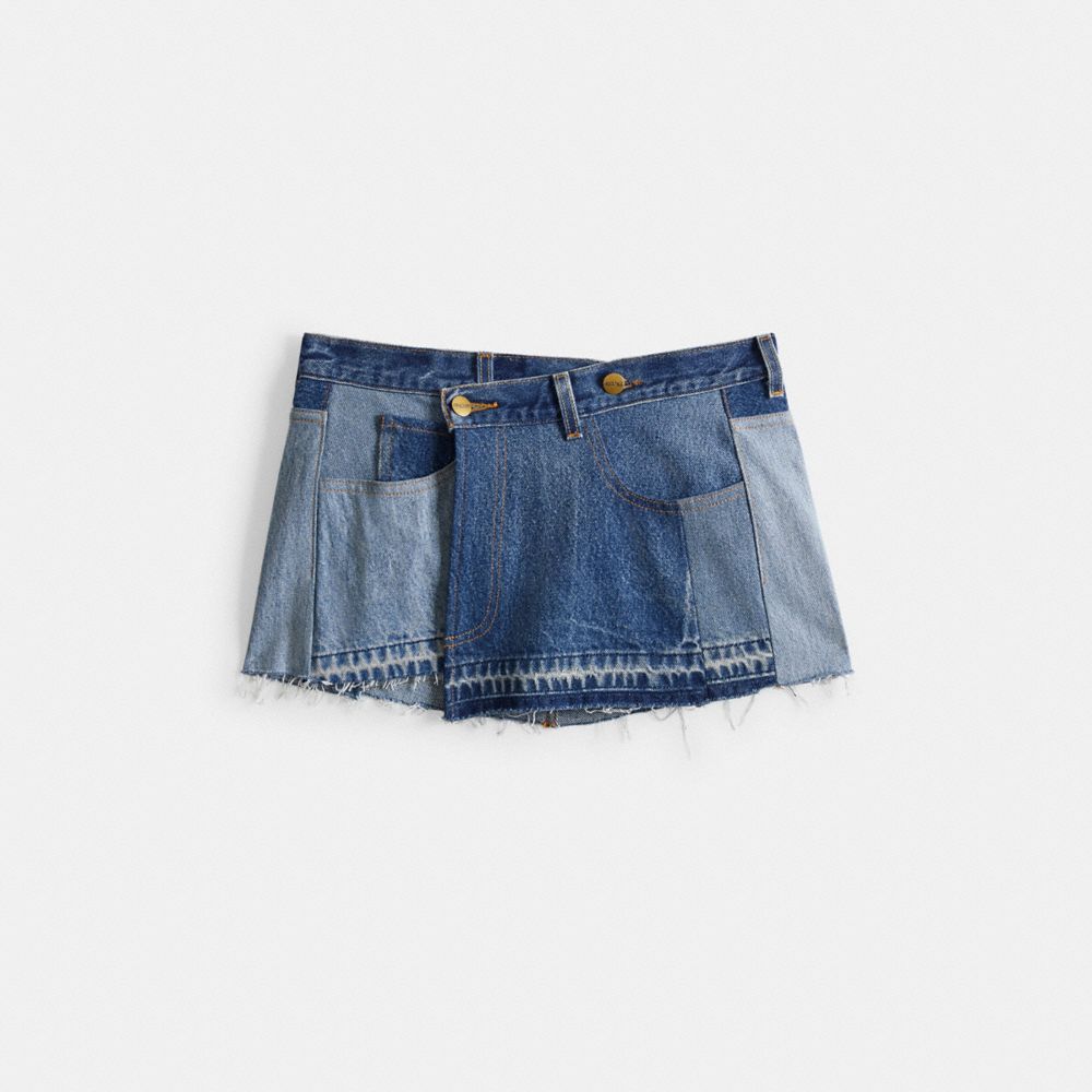 Born again: this Skirt in Repurposed Denim is an ingeniously patchworked piece made from reimagined deadstock and vintage denim pieces.
