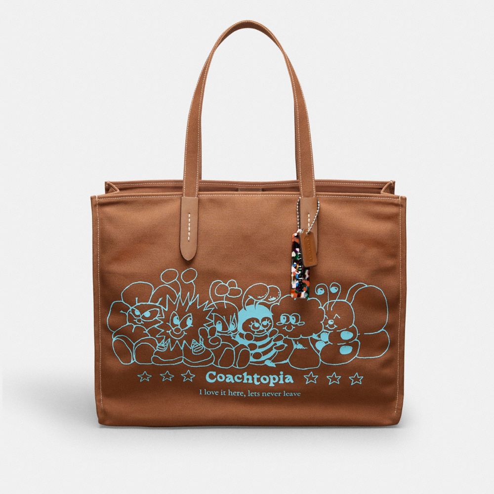 Join us on the road to circularity: the body and handles of this Coachtopia Tote are made from 100% recycled polyester made from post-consumer waste, while its handle tabs are made from at least 50% recycled fibers from leather scraps. This version harnesses the creativity of Coachtopia’s global community, featuring artwork from California-based designer Mikey Poster.