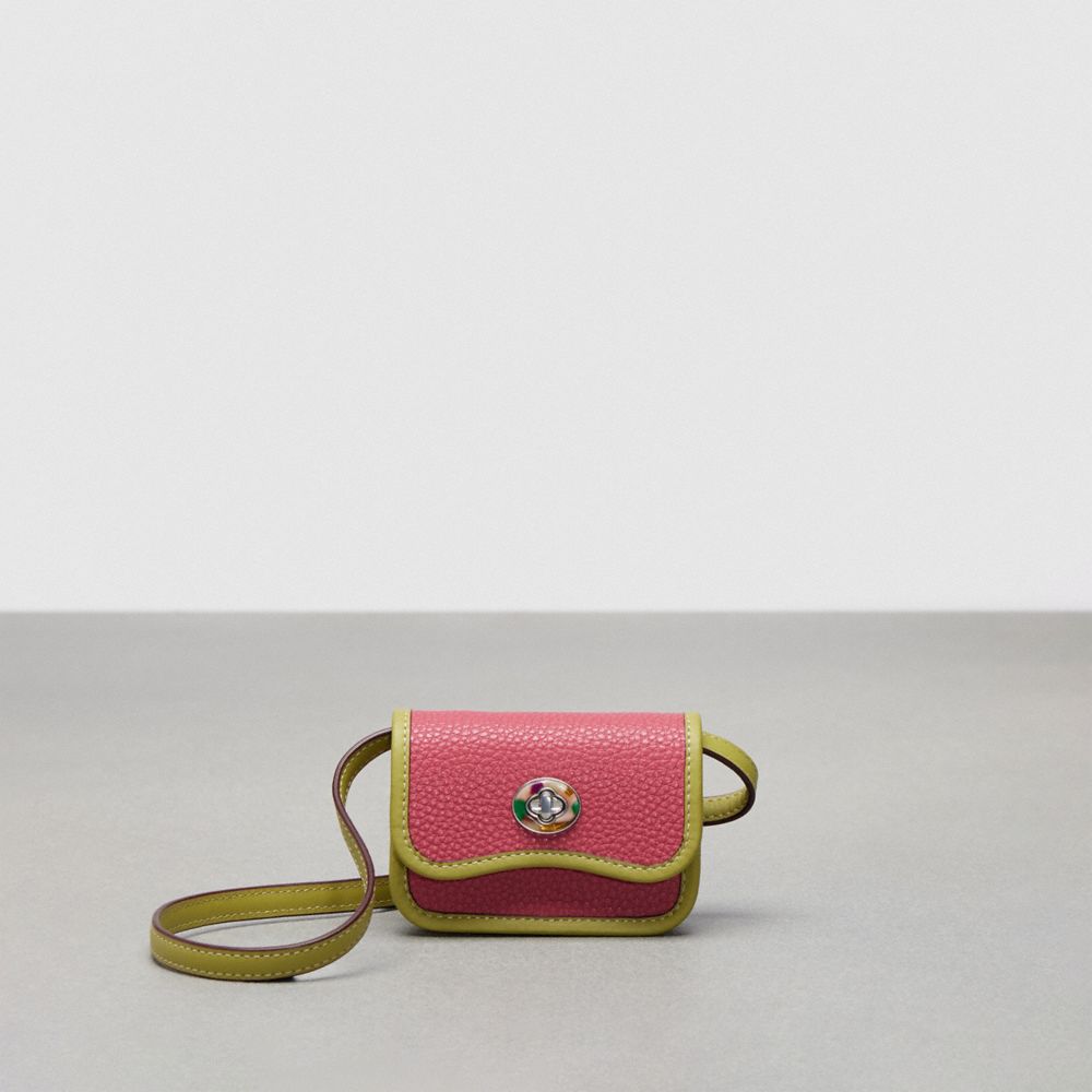 Made for change: the Wavy Wallet is a mini wallet with a removable shoulder strap and turnlock partially made with recycled acrylic plastic—not just splendidly swervy but perfectly sized for carrying coins, notes and cards. This version comes in pebbled Coachtopia leather (crafted with at least 50% recycled fibers from leather scraps).