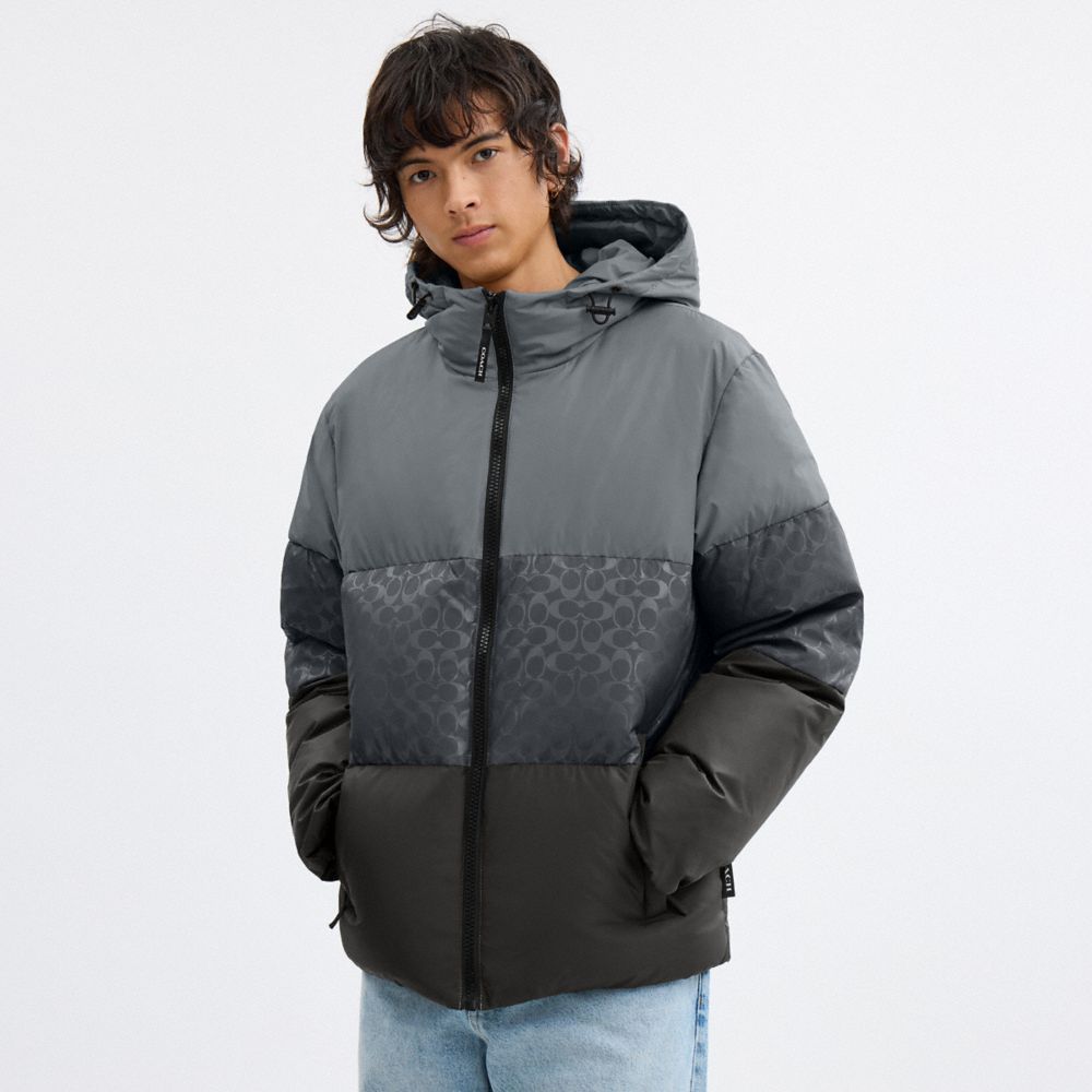 COACH®,Colorblock Down Jacket In Recycled Polyester,Polyester,Recycled Polyester,Down,Puffer,Quilted,Drawstring,Color Bloc...,Multi Color,Front View