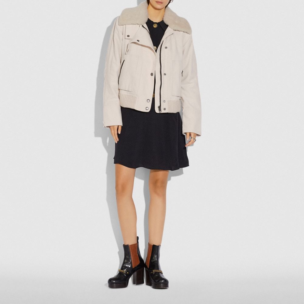 An oversized utilitarian style gets a luxe update in velvety fine-wale corduroy and a super-soft removable shearling collar. Finished with spacious zip pockets for stowing small essentials, the snug throat-latch, contrast quilted lining and cozy ribbed hem will keep out the chill.