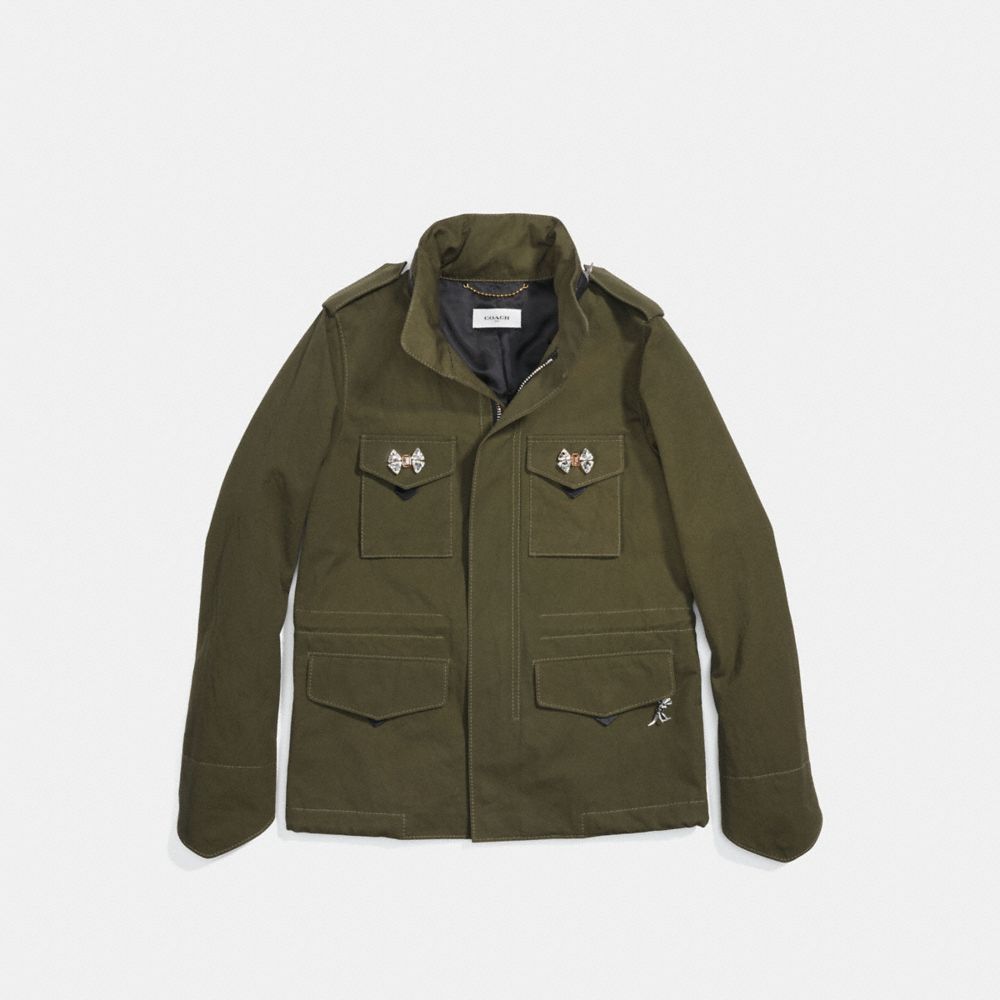 M65 is an iconic Coach silhouette inspired by U.S. military field jackets. It’s made from lightweight cotton and features Art Deco-inspired crystal bows. Based on a vintage tee, the back is emblazoned with a humorous phrase made famous by Americana show Green Acres.
