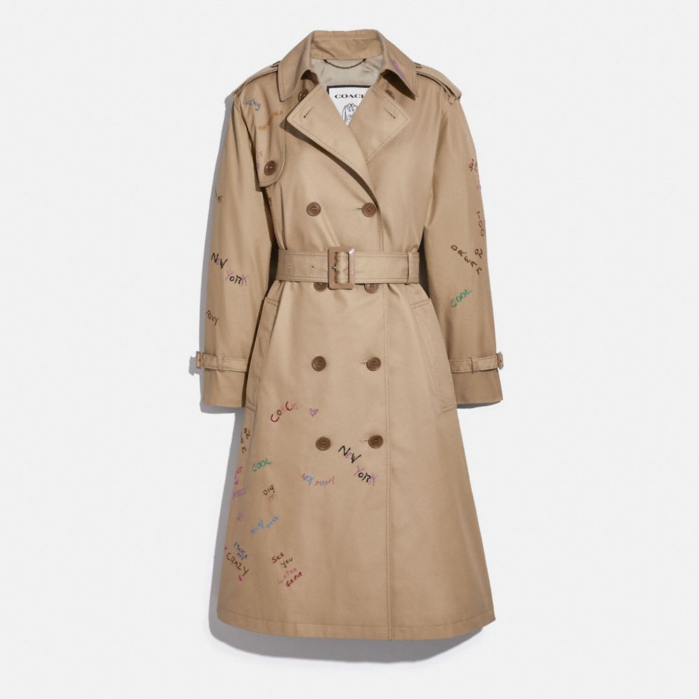 Crafted of fabric made from recycled materials, this limited-edition trench is part of Coach Forever, a collection inspired by our commitment to rethinking and reducing our impact on the planet. Embroidered with lighthearted symbols, sayings and Coach icons, the relaxed-fit design is detailed with epaulettes, a storm flap and belting at the sleeves.