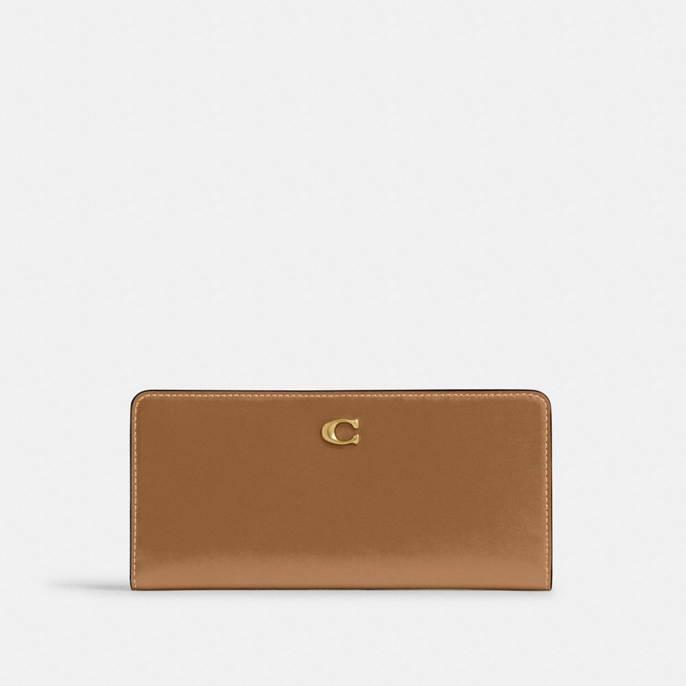 Crafted of refined leather detailed with our Signature hardware, the perfectly named Slim Wallet organizes essentials in a slender silhouette. Featuring an exterior zip pocket for coins, receipts, earbuds and other small essentials, the snap closure opens to reveal 12 card slots and multiple full-length bill compartments for easy organization.