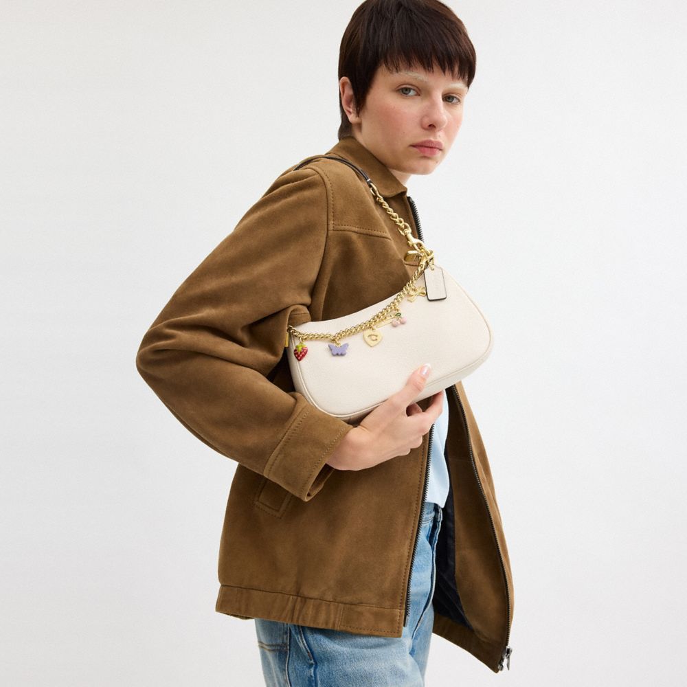 The Gold Swagger Chain with Charms is crafted of sleek metal and vibrant enamel. Effortlessly clip this gold bag chain onto your favorite bag or keychain to add a pop of personality.