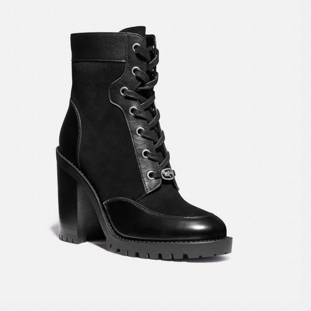 Inspired by the ease and style of traditional hiking boots, the Hedy is reimagined for city streets with a walkable block heel and rubber lug sole for increased traction. Crafted of a mix of rich leather and suede, the lace-up style is finished with a diminutive charm featuring our iconic Horse and Carriage.