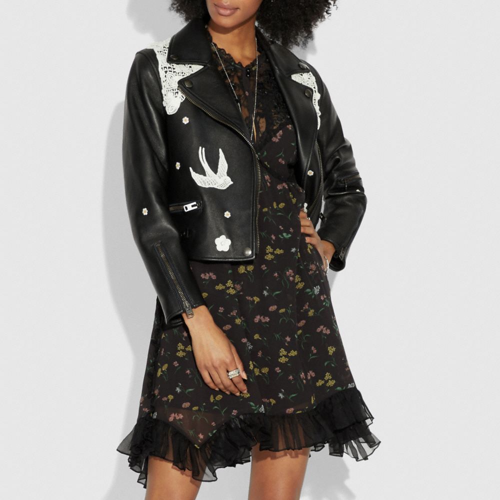 Tough yet tender, our moto vest is embellished with a smattering of daisy floral embroidery and lace appliqué. Crafted in soft lamb leather, it’s detailed with multiple zip pockets and a belted waist.