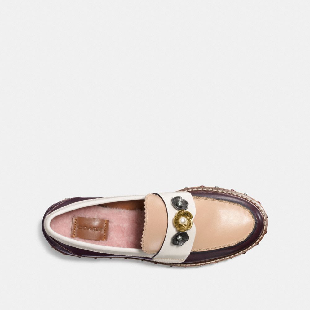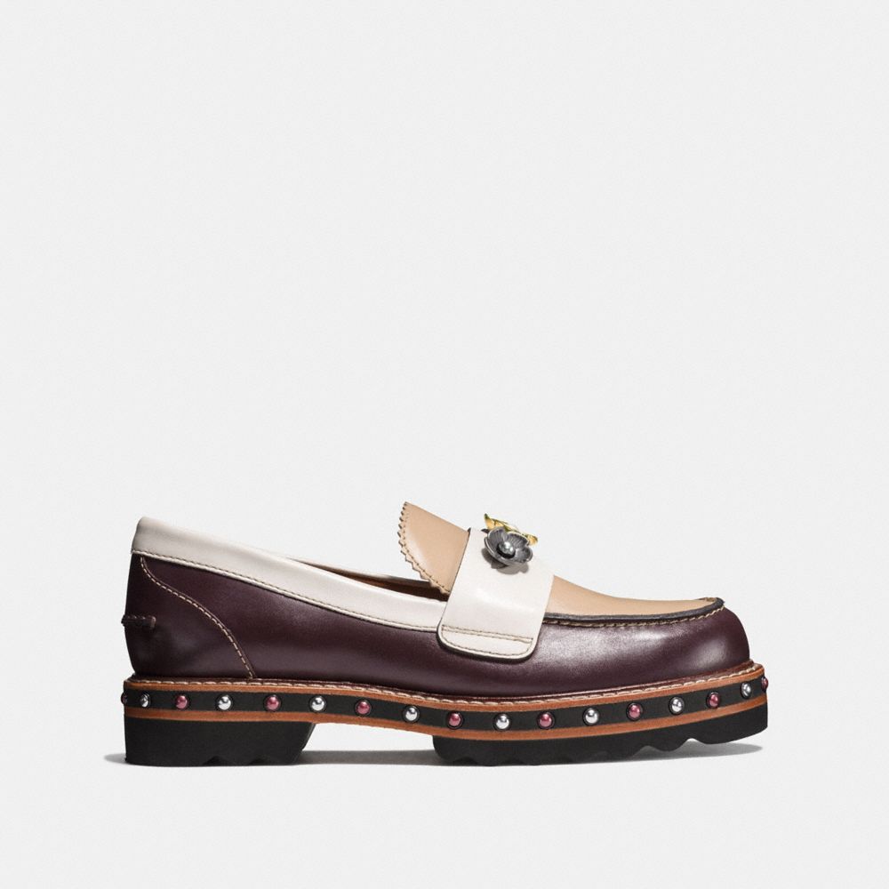 Nostalgic and modern, the Lenox loafer is customized with signature Tea Rose appliqué and pearly cabochons. Crafted of smooth leather with interchangeable shearling and leather insoles, the colorblock design is finished with a studded sole.