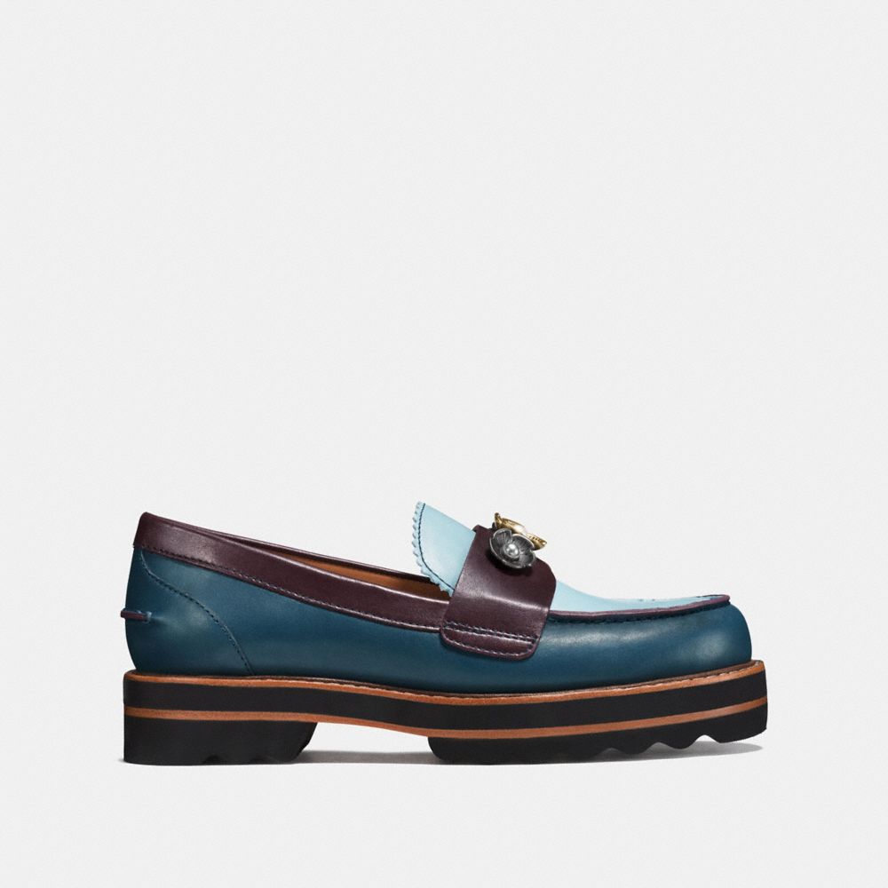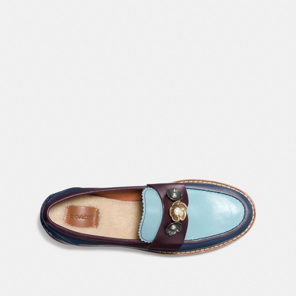Nostalgic and modern, the Lenox loafer is customized with signature Tea Rose appliqué and pearly cabochons. Crafted of smooth colorblock leather with interchangeable shearling and leather insoles, the retro silhouette is finished with a dramatic platform sole.