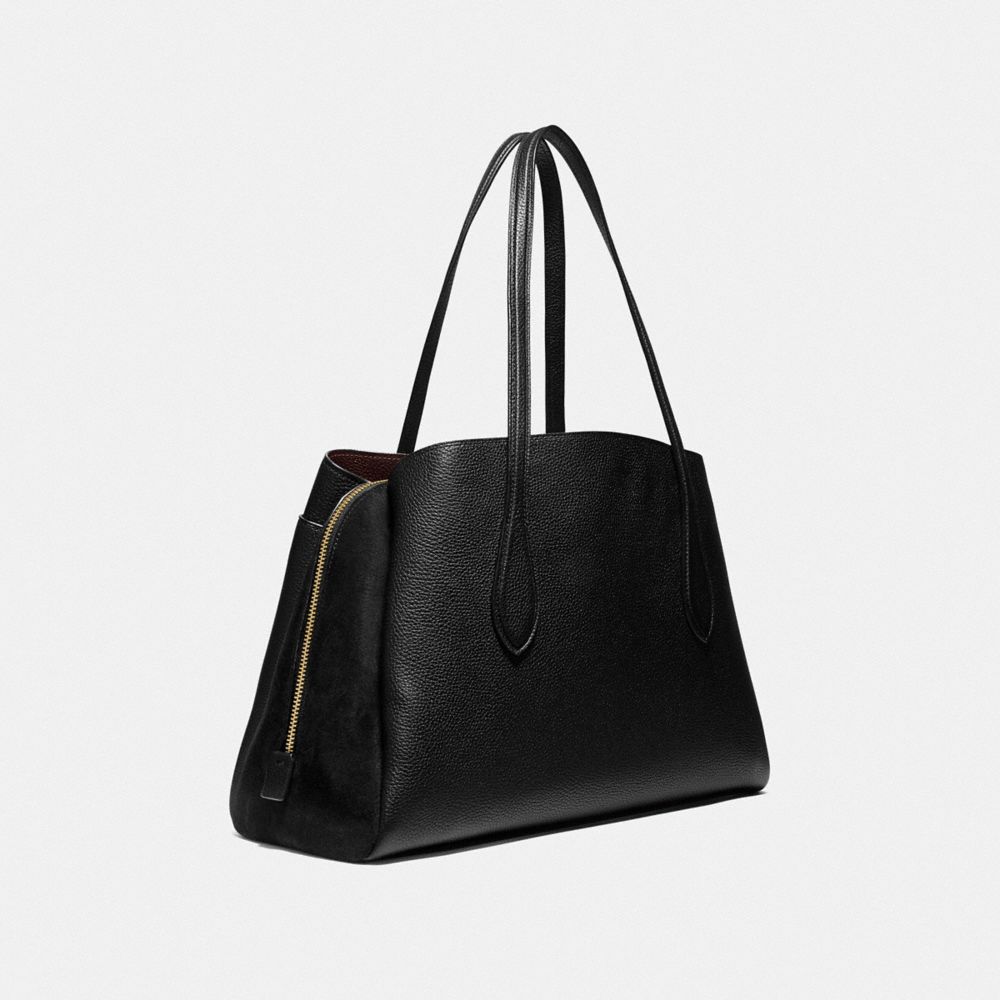 You can have it all. Our Lora Carryall is versatile, practical and extremely good looking. The polished pebble leather and suede design has three compartments for easy organization and space for a 13" laptop. The exterior slip pocket provides easy access to essentials and secures with our iconic turnlock closure.