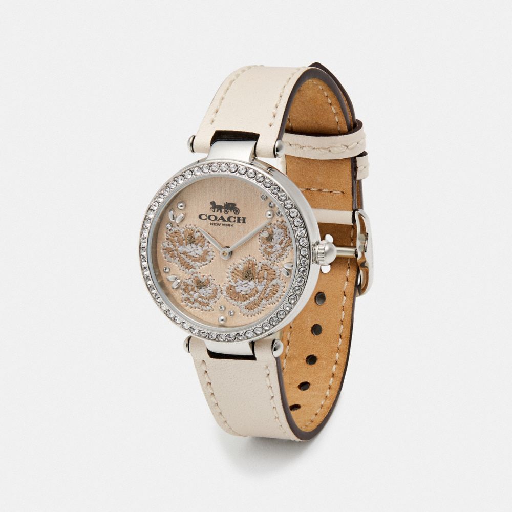 Named for the glamorous New York City Street, the Park is an elegant day-to-night style detailed with shimmering crystals. The stainless steel design features an embroidery-inspired floral print dial and is finished with a smooth leather strap.