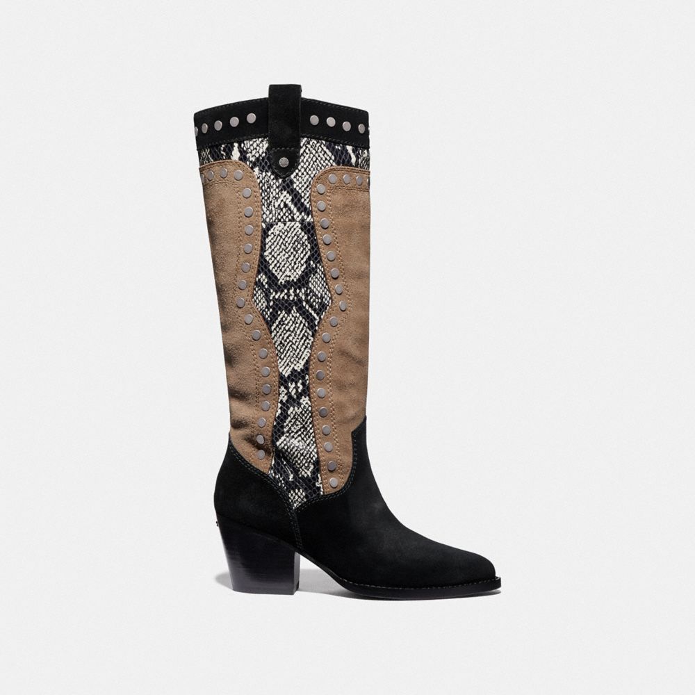 Allover polished rivets and a pointy toe add a Western vibe to our knee-high Payton boot. Crafted of a colorblock mix of suede and exotic snake-embossed leather, it’s finished with a chunky block heel that’s perfect for all-day wear.