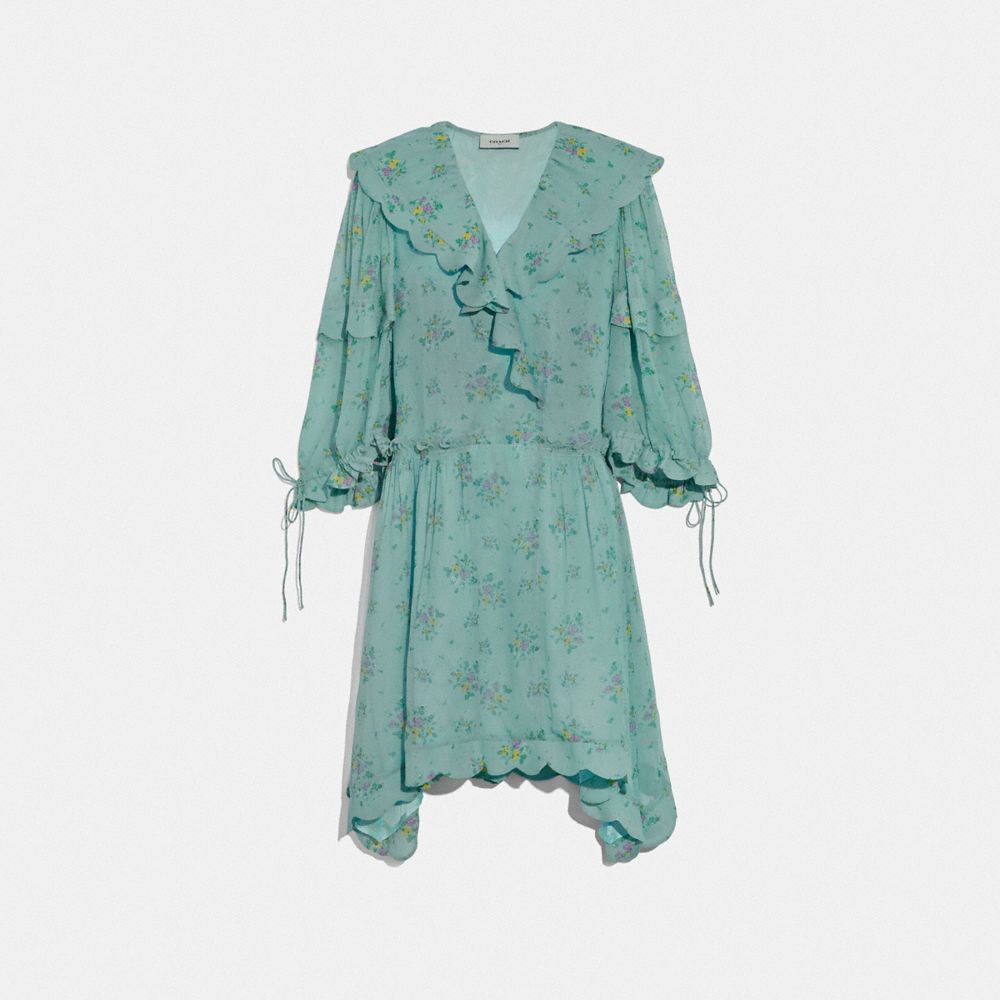 Featuring a nostalgic floral bouquet print, this slightly sheer silk dress features a romantic portrait collar and scalloped details. Gathered stitching and a handkerchief hem add airy movement