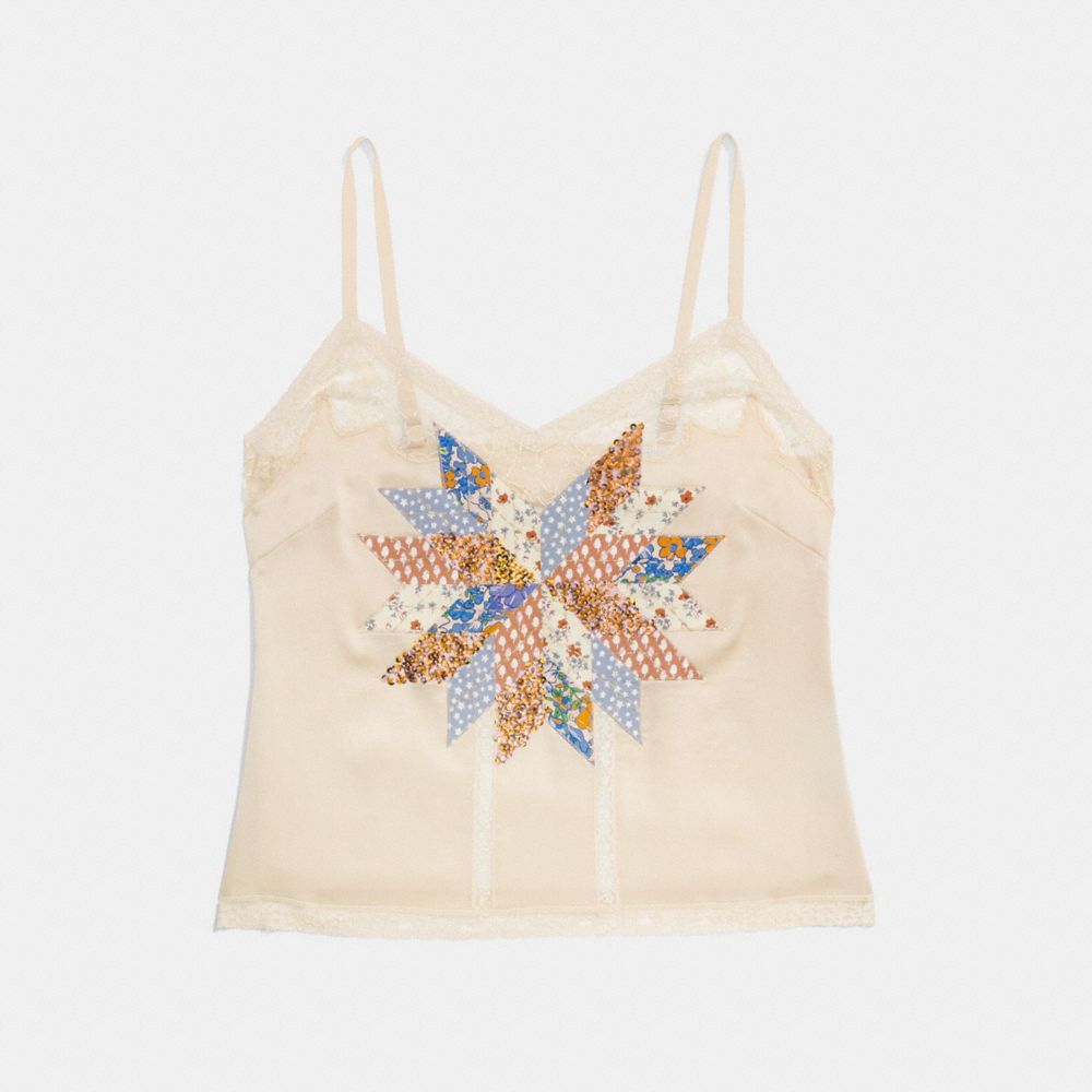 Drawing on slip dresses from the 1950s, this camisole is detailed with prairie patchwork inspired by a vintage American quilt. Scalloped lace trim adds sensuality to this nostalgic top.