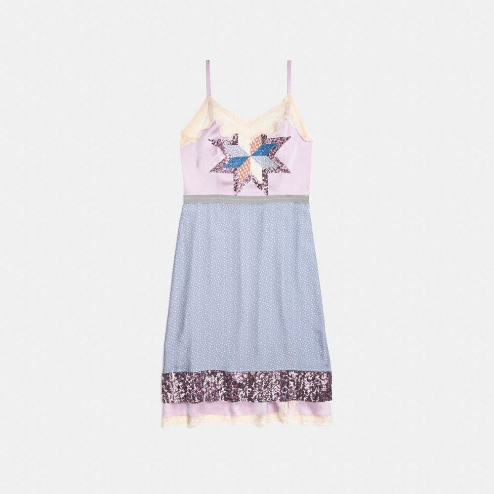 A downtown, undone take on dressing up, this 1950s-inspired slip dress features prairie patchwork, a feminine interpretation of a vintage American quilt. Lace trim and a sequined hem detail the delicate silhouette.