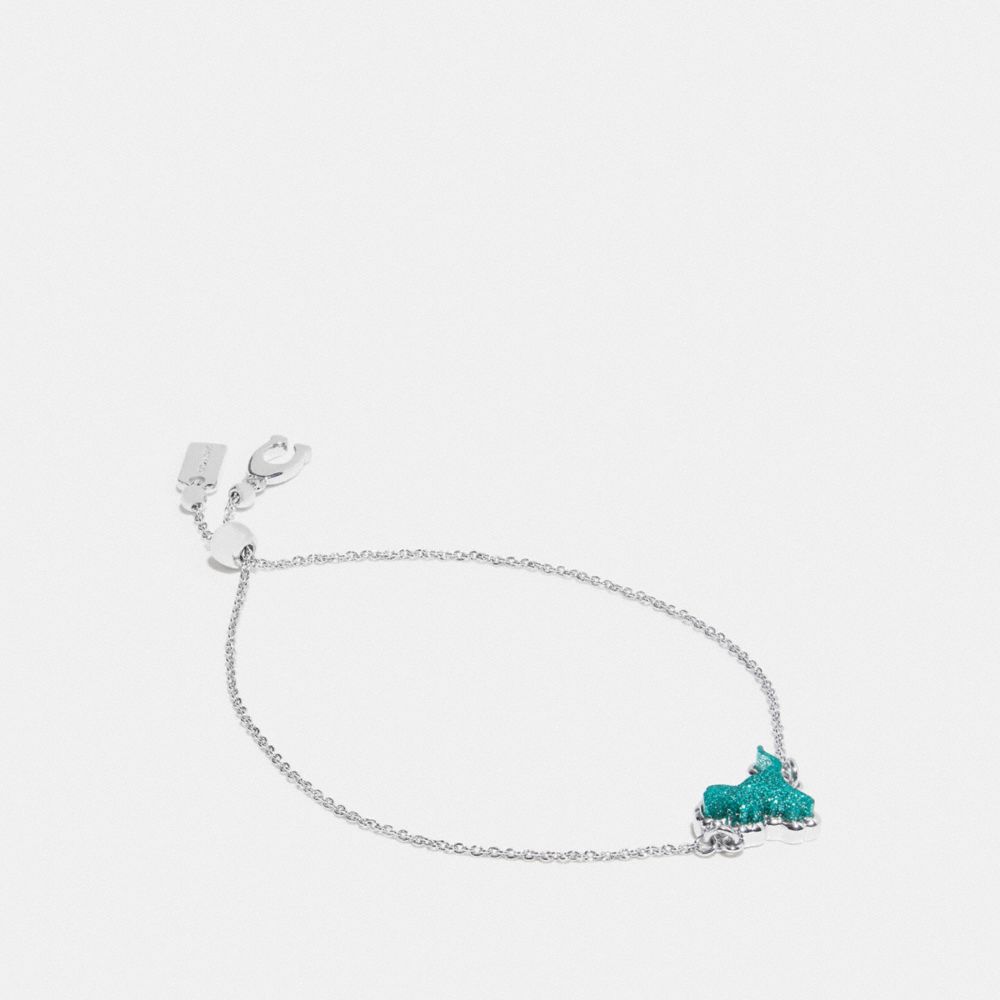 This delicate bracelet features a tiny Rexy the Coach dino shimmering with a colorful glitter resin finish. Wear it alone or layer it with other favorites.