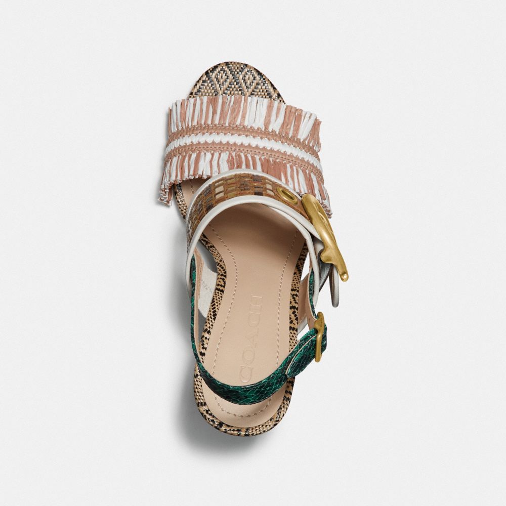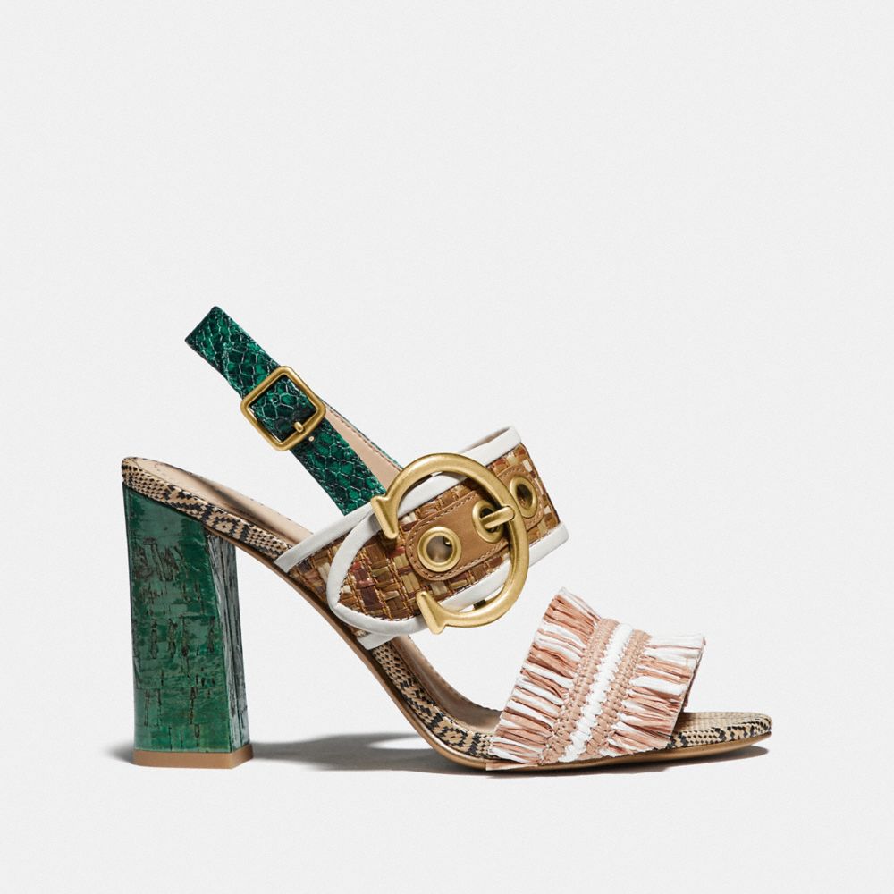 A warm-weather slingback with a sturdy block heel, our Robin sandal is perfect with everything from denim to dresses. Featuring woven raffia with fringed edges, it’s finished with our Coach buckle for a touch of shine.
