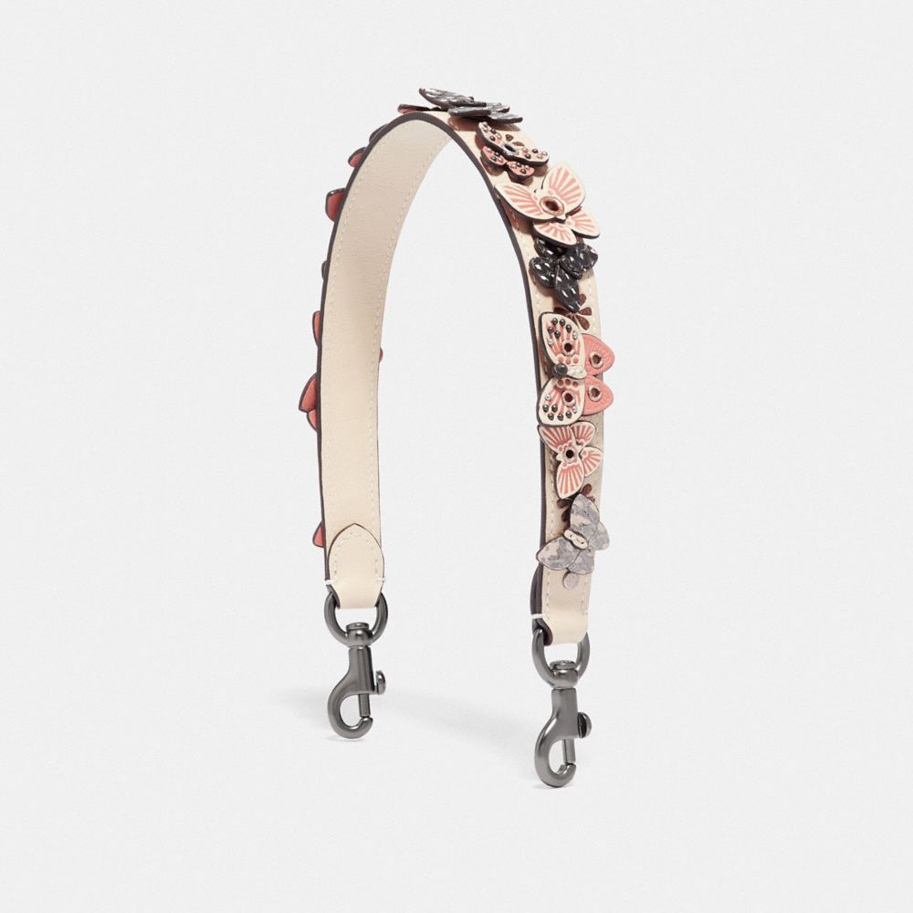 Instantly update your bag or clutch with this refined leather short strap detailed with our graceful butterfly appliqué, a dimensional motif inspired by our love of nature and the freedom of the open road. The interchangeable style features two dogleash clips that allow you to attach it to our most popular styles.
