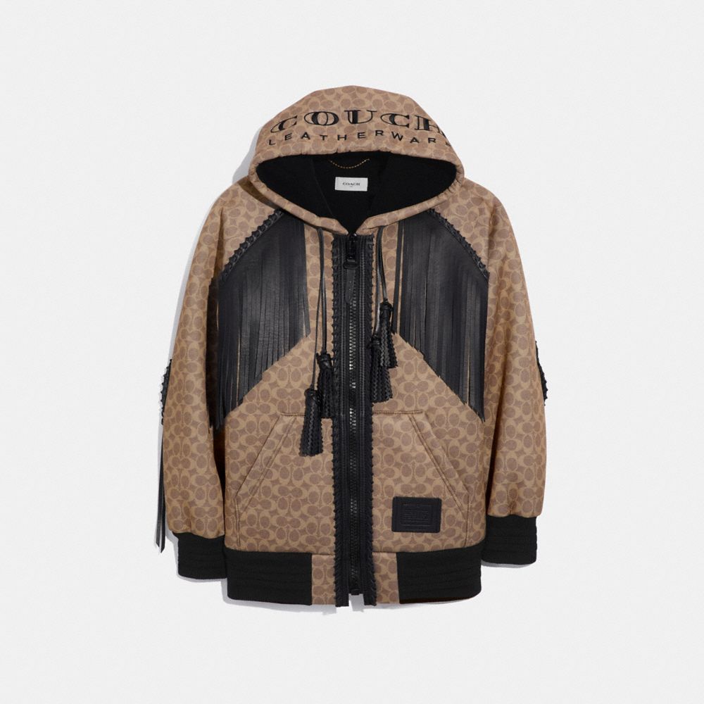 Neoprene lends a structured look and a soft, cushiony feel to this reimagined athletic staple. Lined with velvet, this Signature style features a hood embroidered with “Couch”, an intentionally ironic take on the Coach name.