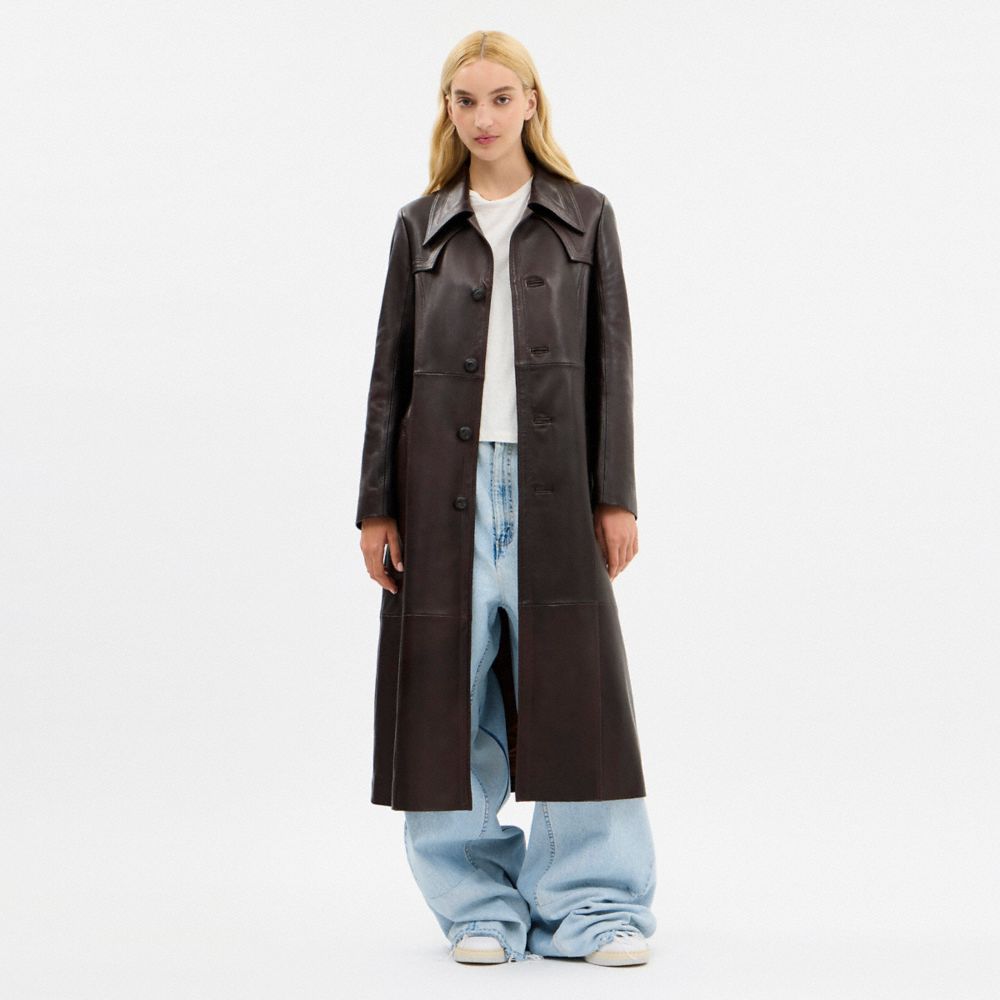 Inspired by exaggerated 1970s fashion, this luxe update on the traditional trench coat is crafted of super-soft supple leather. Detailed with an oversized collar and a belted waist to help define the shape, this longline design is finished with our Signature button closure and a back vent for added mobility.