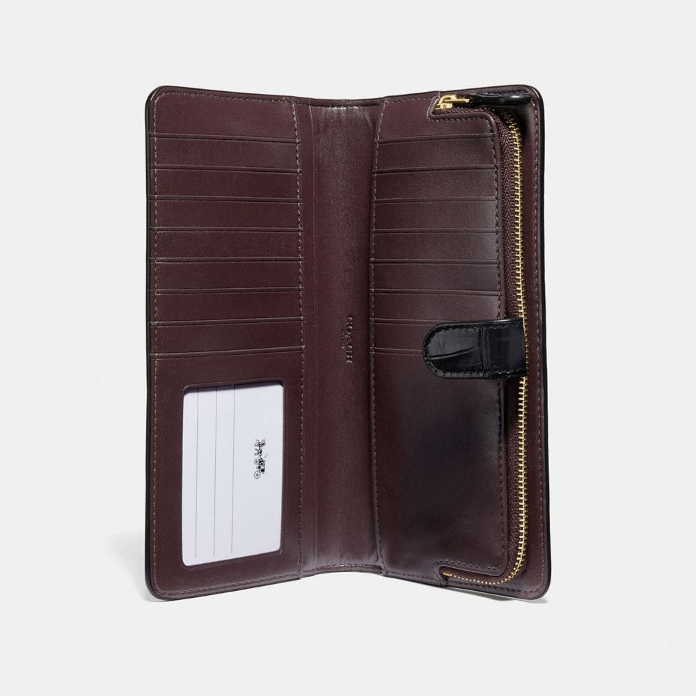 Crafted in distinctive crocodile-embossed leather, the perfectly named Skinny Wallet organizes essentials in a slender silhouette. The snap closure opens to reveal 15 card slots, multiple full-length bill compartments, a zippered coin pocket and a convenient ID window.