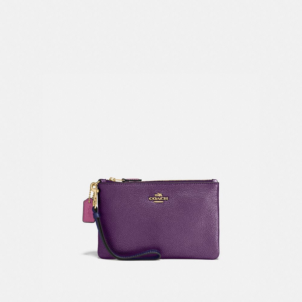 Crafted of colorblock polished pebble leather finished with a brilliant metallic sheen, this wristlet is perfectly sized for cards, cash and a phone. Wear it on your wrist or clip it inside a larger Coach bag.