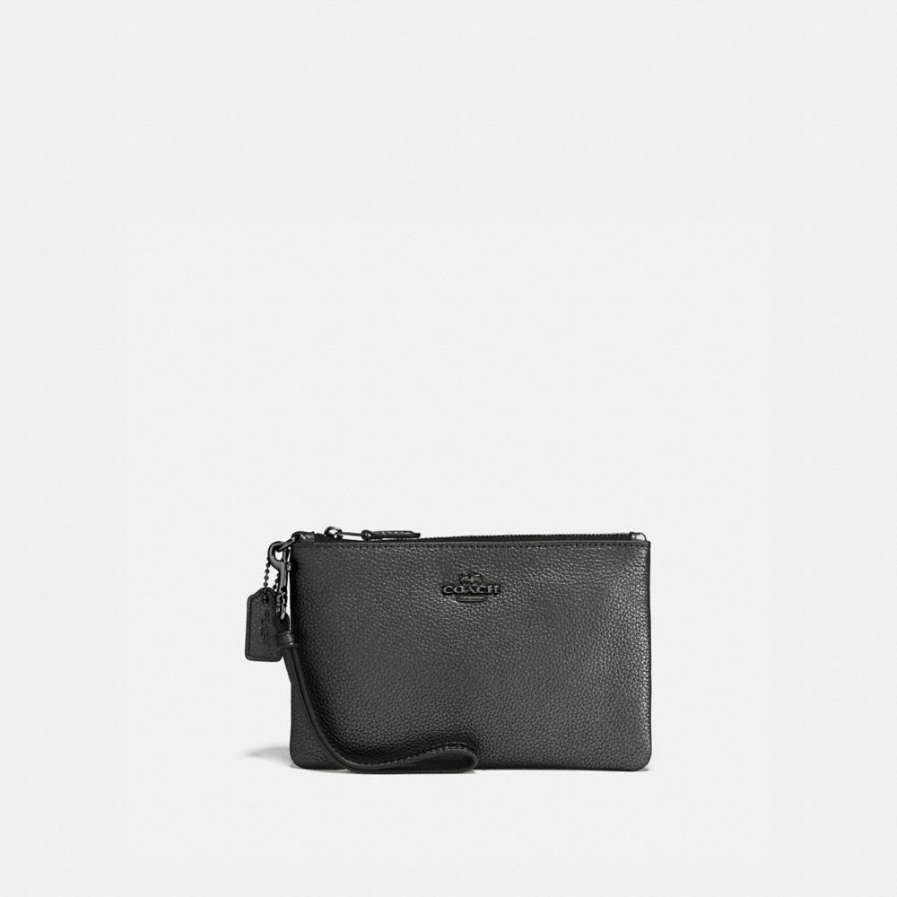 Crafted in metallic polished pebble leather, this wristlet is perfectly sized for cards, cash and a phone. Wear it on your wrist or clip it inside a larger Coach bag.