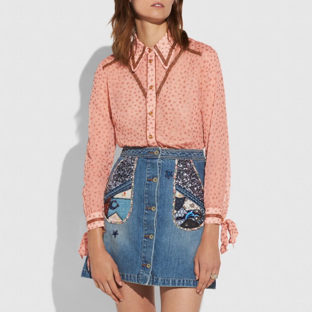 A little bit Western, a little bit downtown New York. This sheer blouse is crafted in delicate georgette with shimmering stars. Feminine scalloped leather detail is contrasted with tiny metal rivets, adding a touch of attitude to the flowy silhouette. Signature Tea Rose buttons and wrist ties finish the look.
