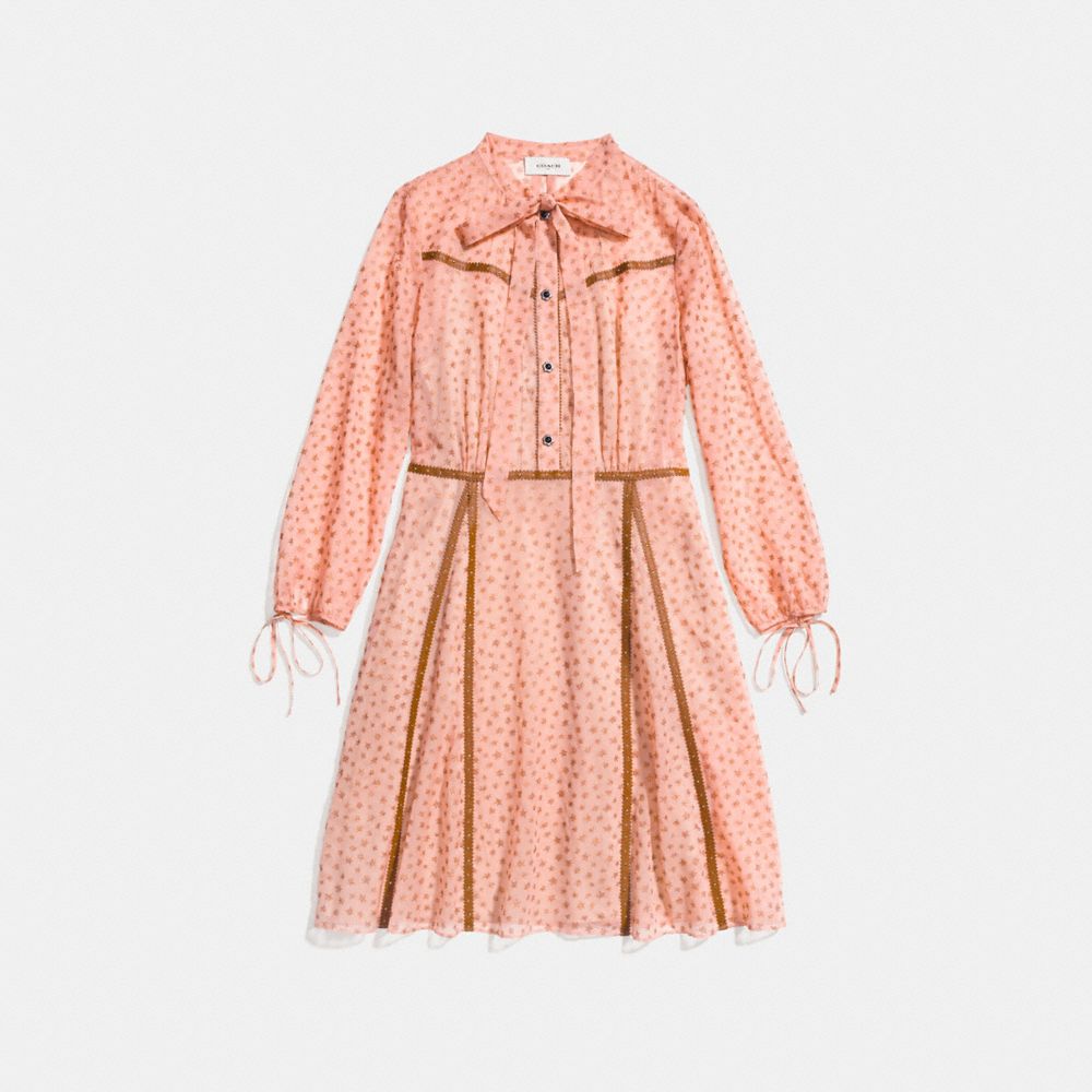 Born somewhere between the streets of downtown New York and the American West, this sheer dress is crafted in delicate georgette with shimmering stars. Studded leather accents add texture—and a little attitude—to the nostalgic silhouette. Slip included.