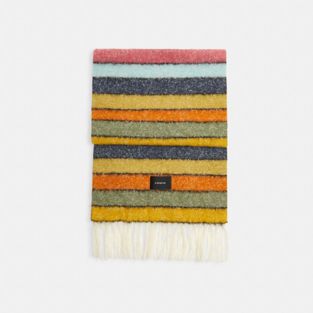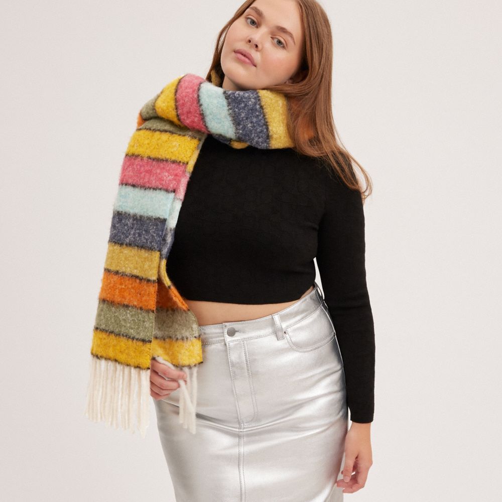 A colorful, bold design, this striped scarf is crafted of a soft, lightweight alpaca-blend. Accented with fringe trim, it brightens up cold weather days and nights.