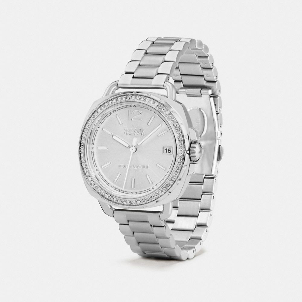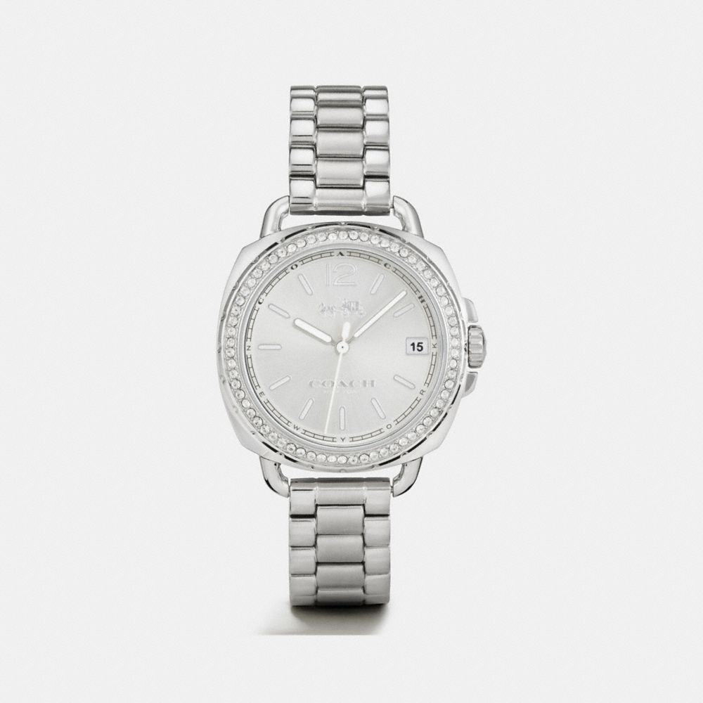 The Tatum is a borrowed-from-the-boys style crafted in sleek stainless steel. A crystal bezel adds feminine sparkle.